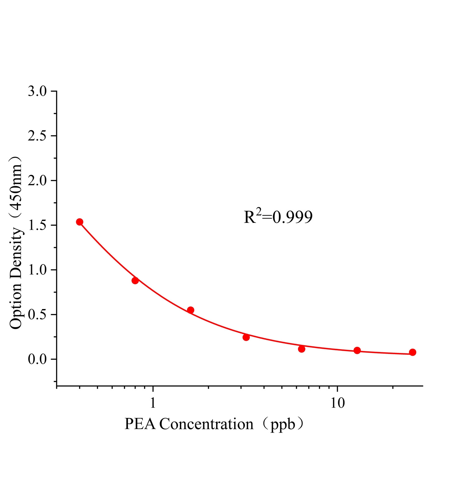 本试剂盒采用间接竞争ELISA方法,在酶标板微孔条上预包被偶联抗原,样本中苯乙醇胺A和微孔条上预包被的偶联抗原竞争苯乙醇胺A抗体,加入酶标二抗后,形成包被抗原-抗体-酶标二抗复合物。随后结合的酶催化TMB底物显色,样本吸光值与其含有的苯乙醇胺A成负相关。通过标准曲线可准确定量样品中苯乙醇胺A的含量。通过标准曲线计算所得值乘以样品处理的稀释倍数即为实际样品中苯乙醇胺A的含量。