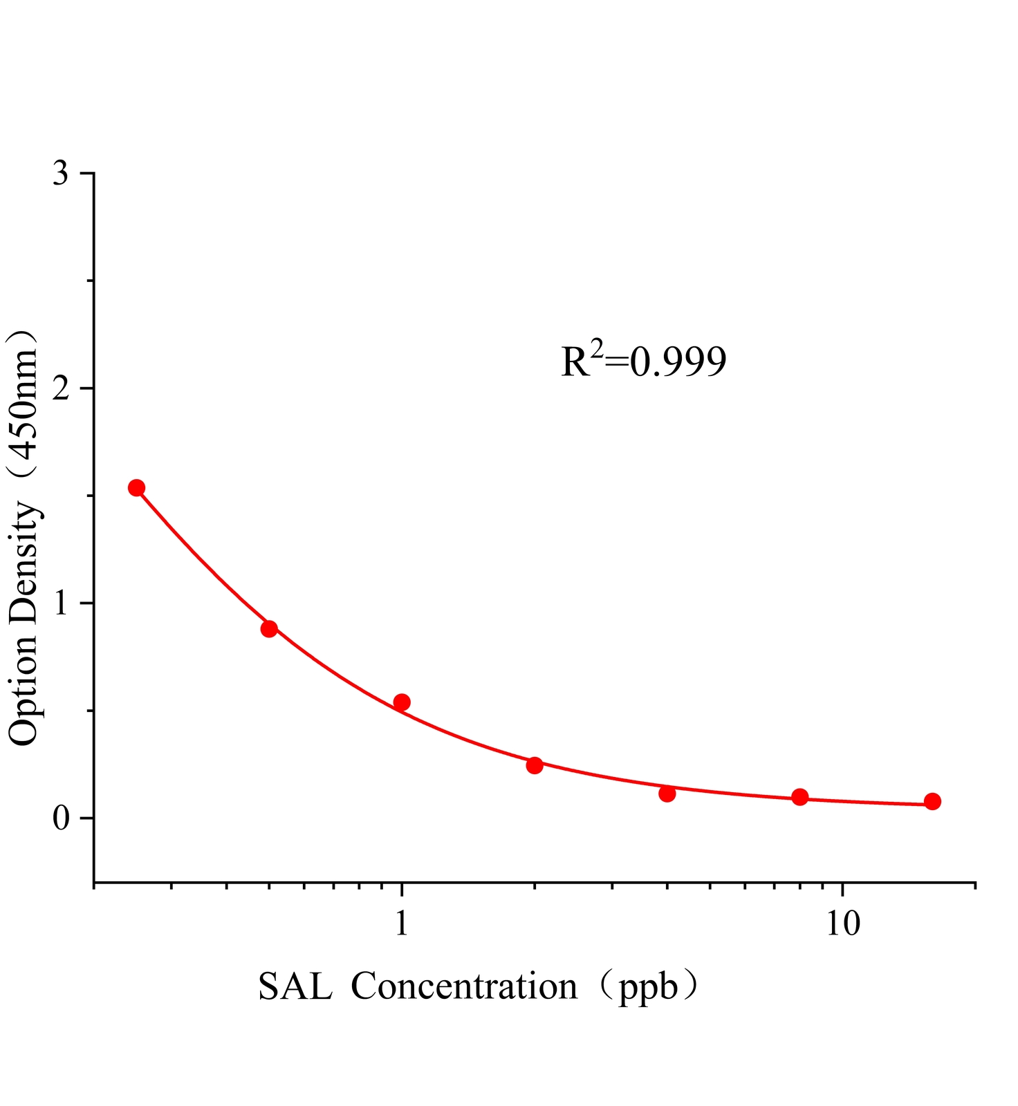 本试剂盒采用间接竞争ELISA方法,在酶标板微孔条上预包被偶联抗原,样本中沙丁胺醇和微孔条上预包被的偶联抗原竞争沙丁胺醇抗体,加入酶标二抗后,形成包被抗原-抗体-酶标二抗复合物。随后结合的酶催化TMB底物显色,样本吸光值与其含有的沙丁胺醇成负相关。通过标准曲线可准确定量样品中沙丁胺醇的含量。通过标准曲线计算所得值乘以样品处理的稀释倍数即为实际样品中沙丁胺醇的含量。