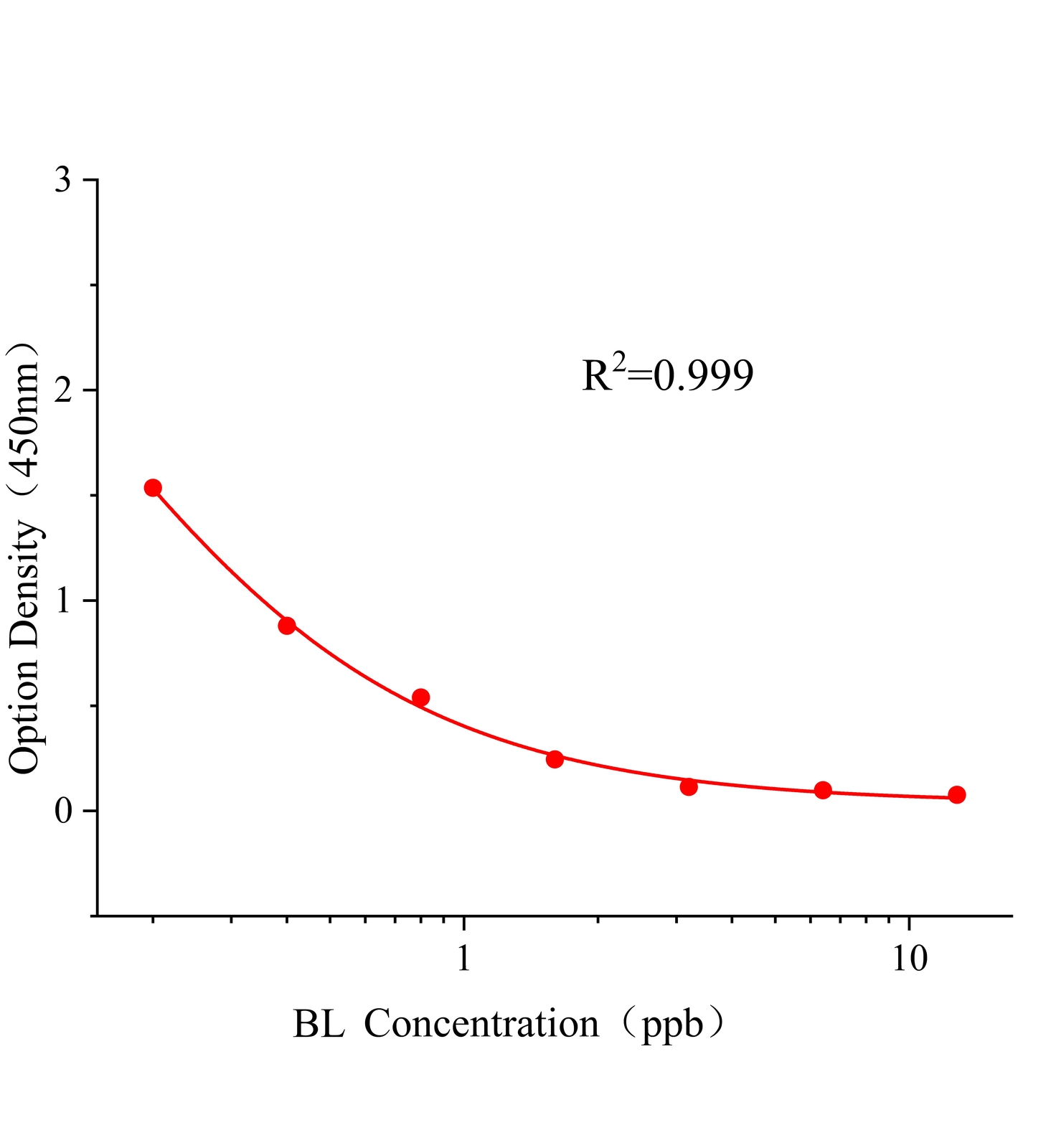 本试剂盒采用间接竞争ELISA方法,在酶标板微孔条上预包被偶联抗原,样本中溴布特罗和微孔条上预包被的偶联抗原竞争溴布特罗抗体,加入酶标二抗后,形成包被抗原-抗体-酶标二抗复合物。随后结合的酶催化TMB底物显色,样本吸光值与其含有的溴布特罗成负相关。通过标准曲线可准确定量样品中溴布特罗的含量。通过标准曲线计算所得值乘以样品处理的稀释倍数即为实际样品中溴布特罗的含量。