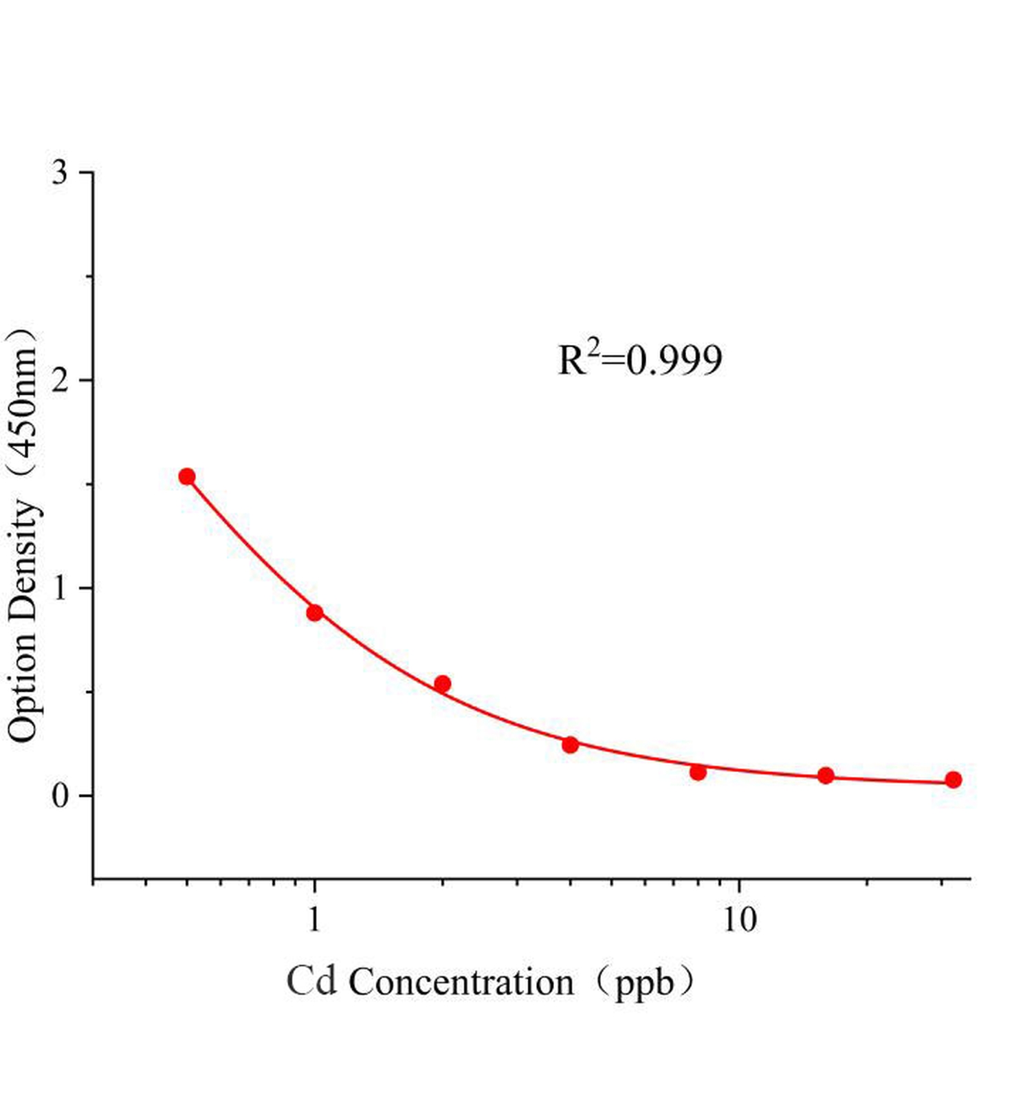 本试剂盒采用间接竞争ELISA方法,在酶标板微孔条上预包被偶联抗原,样本中镉和微孔条上预包被的偶联抗原竞争镉抗体,加入酶标二抗后,形成包被抗原-抗体-酶标二抗复合物。随后结合的酶催化TMB底物显色,样本吸光值与其含有的镉成负相关。通过标准曲线可准确定量样品中镉的含量。通过标准曲线计算所得值乘以样品处理的稀释倍数即为实际样品中镉的含量。