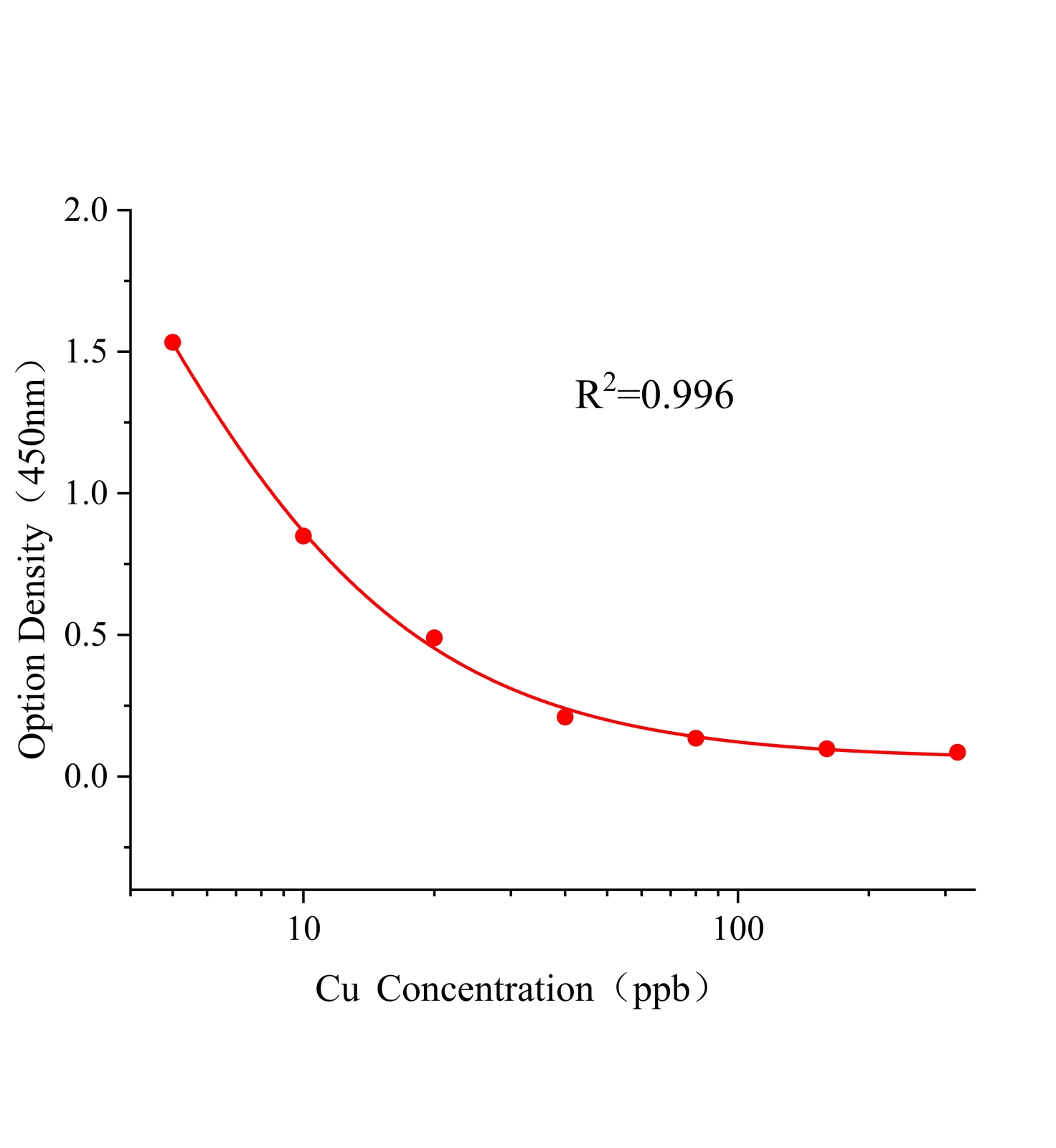 本试剂盒采用间接竞争ELISA方法,在酶标板微孔条上预包被偶联抗原,样本中铜和微孔条上预包被的偶联抗原竞争铜抗体,加入酶标二抗后,形成包被抗原-抗体-酶标二抗复合物。随后结合的酶催化TMB底物显色,样本吸光值与其含有的铜成负相关。通过标准曲线可准确定量样品中铜的含量。通过标准曲线计算所得值乘以样品处理的稀释倍数即为实际样品中铜的含量。