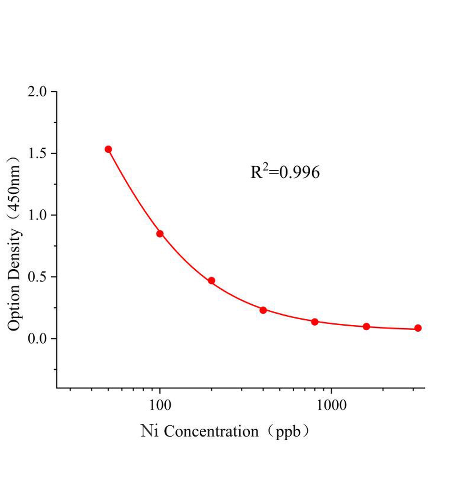 本试剂盒采用间接竞争ELISA方法,在酶标板微孔条上预包被偶联抗原,样本中镍和微孔条上预包被的偶联抗原竞争镍抗体,加入酶标二抗后,形成包被抗原-抗体-酶标二抗复合物。随后结合的酶催化TMB底物显色,样本吸光值与其含有的镍成负相关。通过标准曲线可准确定量样品中镍的含量。通过标准曲线计算所得值乘以样品处理的稀释倍数即为实际样品中镍的含量。