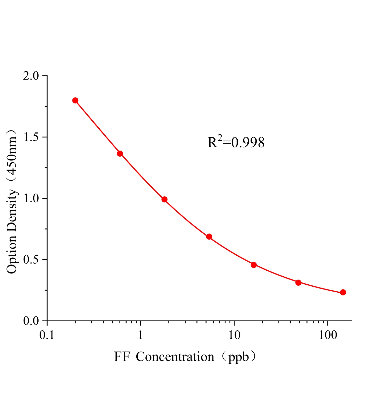 本试剂盒采用间接竞争ELISA方法,在酶标板微孔条上预包被偶联抗原,样本中氟苯尼考和微孔条上预包被的偶联抗原竞争氟苯尼考抗体,加入酶标二抗后,形成包被抗原-抗体-酶标二抗复合物。随后结合的酶催化TMB底物显色,样本吸光值与其含有的氟苯尼考成负相关。通过标准曲线可准确定量样品中氟苯尼考的含量。通过标准曲线计算所得值乘以样品处理的稀释倍数即为实际样品中氟苯尼考的含量。