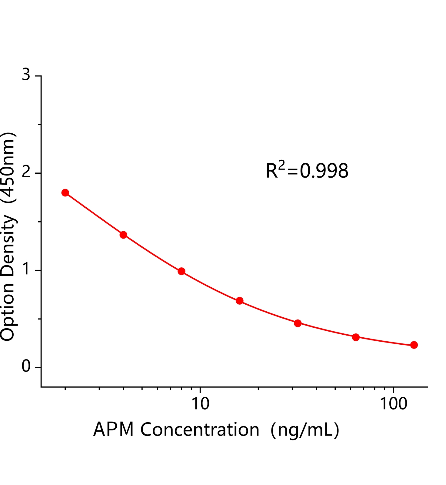 本试剂盒采用间接竞争ELISA方法,在酶标板微孔条上预包被偶联抗原,样本中安普霉素和微孔条上预包被的偶联抗原竞争安普霉素抗体,加入酶标二抗后,形成包被抗原-抗体-酶标二抗复合物。随后结合的酶催化TMB底物显色,样本吸光值与其含有的安普霉素成负相关。通过标准曲线可准确定量样品中安普霉素的含量。通过标准曲线计算所得值乘以样品处理的稀释倍数即为实际样品中安普霉素的含量。