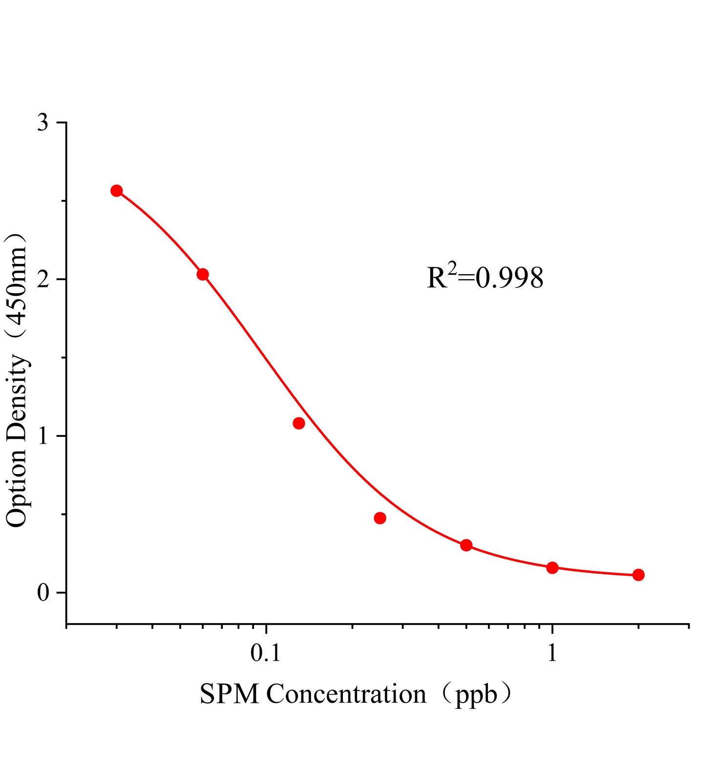 本试剂盒采用间接竞争ELISA方法,在酶标板微孔条上预包被偶联抗原,样本中大观霉素和微孔条上预包被的偶联抗原竞争大观霉素抗体,加入酶标二抗后,形成包被抗原-抗体-酶标二抗复合物。随后结合的酶催化TMB底物显色,样本吸光值与其含有的大观霉素成负相关,通过标准曲线可准确定量样品中大观霉素的含量。通过标准曲线计算所得值乘以样品处理的稀释倍数即为实际样品中大观霉素的含量。