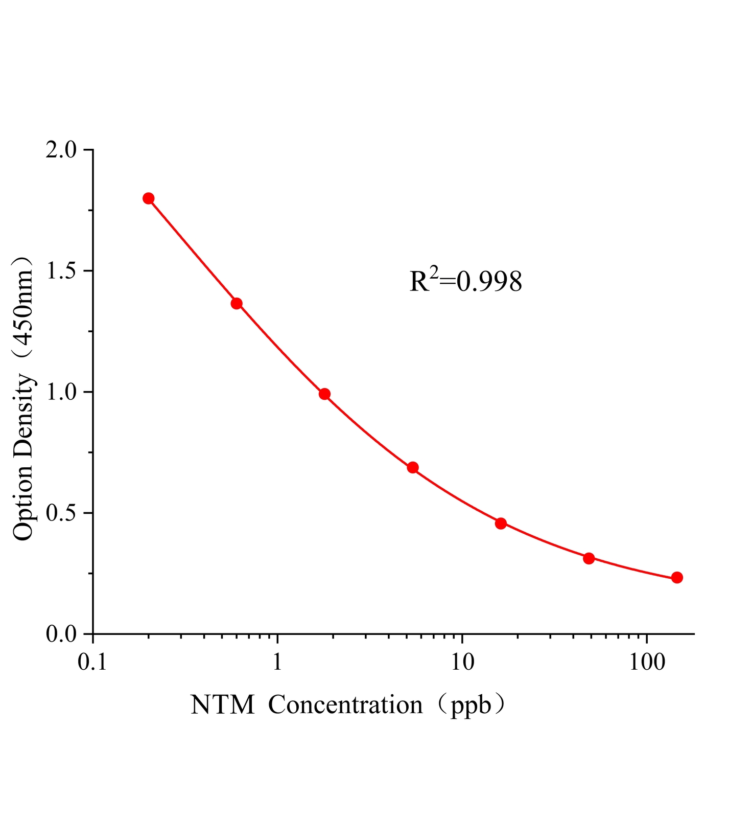 本试剂盒采用间接竞争ELISA方法,在酶标板微孔条上预包被偶联抗原,样本中奈替米星和微孔条上预包被的偶联抗原竞争奈替米星抗体,加入酶标二抗后,形成包被抗原-抗体-酶标二抗复合物。随后结合的酶催化TMB底物显色,样本吸光值与其含有的奈替米星成负相关。通过标准曲线可准确定量样品中奈替米星的含量。通过标准曲线计算所得值乘以样品处理的稀释倍数即为实际样品中奈替米星的含量。