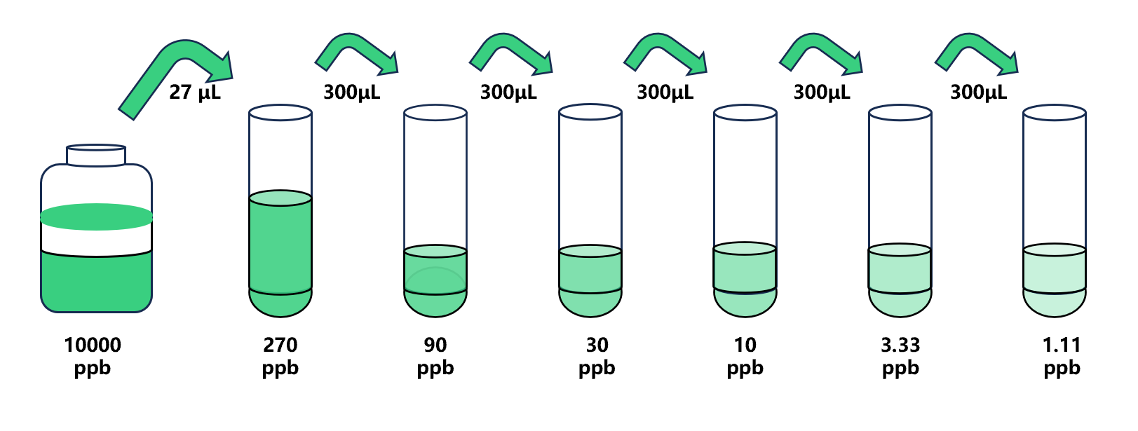 标准品配制:试剂盒中取出标准品,准备7个试管,先将10000 ppb标准品(100µL)按需吸取一定量用1×稀释液稀释至270 ppb(例:27µL的标准品母液+973µL的1×稀释液,制备得到1000μL的270 ppb浓度标准品),随后在5个试管中分别加入600μL的1×稀释液,在这5个单独的试管中将270 ppb标准品依次3倍倍比稀释至6个梯度,共配制6个浓度的标准品,依次为:270 ppb、90 ppb、30 ppb、10 ppb、3.33 ppb、1.11 ppb,从最高浓度标准品溶液中吸取300μL标准品到下一个试管中,轻轻吹打混匀,以此类推进行标准品的倍比稀释(如图所示),1×稀释液用作零浓度标准品(0ppb)。