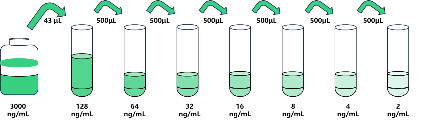 标准品配制:试剂盒中取出标准品,准备7个试管,先将3000 ng/mL标准品(200µL)按需吸取一定量用1×稀释液稀释至128 ng/mL(例:43µL的标准品母液+957µL的1×稀释液,制备得到1000μL的128 ng/mL浓度标准品),随后在6个试管中分别加入500μL的1×稀释液,在这6个单独的试管中将128 ng/mL标准品依次2倍倍比稀释至7个梯度,共配制7个浓度的标准品,依次为:128 ng/mL、64 ng/mL、32 ng/mL、16 ng/mL、8 ng/mL、4 ng/mL、2 ng/mL,从最高浓度标准品溶液中吸取500μL标准品到下一个试管中,轻轻吹打混匀,以此类推进行标准品的倍比稀释(如图所示),1×稀释液用作零浓度标准品(0ng/mL)。