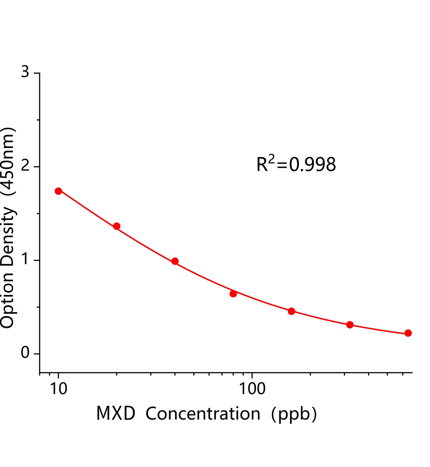 本试剂盒采用间接竞争ELISA方法,在酶标板微孔条上预包被偶联抗原,样本中莫西菌素和微孔条上预包被的偶联抗原竞争莫西菌素抗体,加入酶标二抗后,形成包被抗原-抗体-酶标二抗复合物。随后结合的酶催化TMB底物显色,样本吸光值与其含有的莫西菌素成负相关。通过标准曲线可准确定量样品中莫西菌素的含量。通过标准曲线计算所得值乘以样品处理的稀释倍数即为实际样品中莫西菌素的含量。
