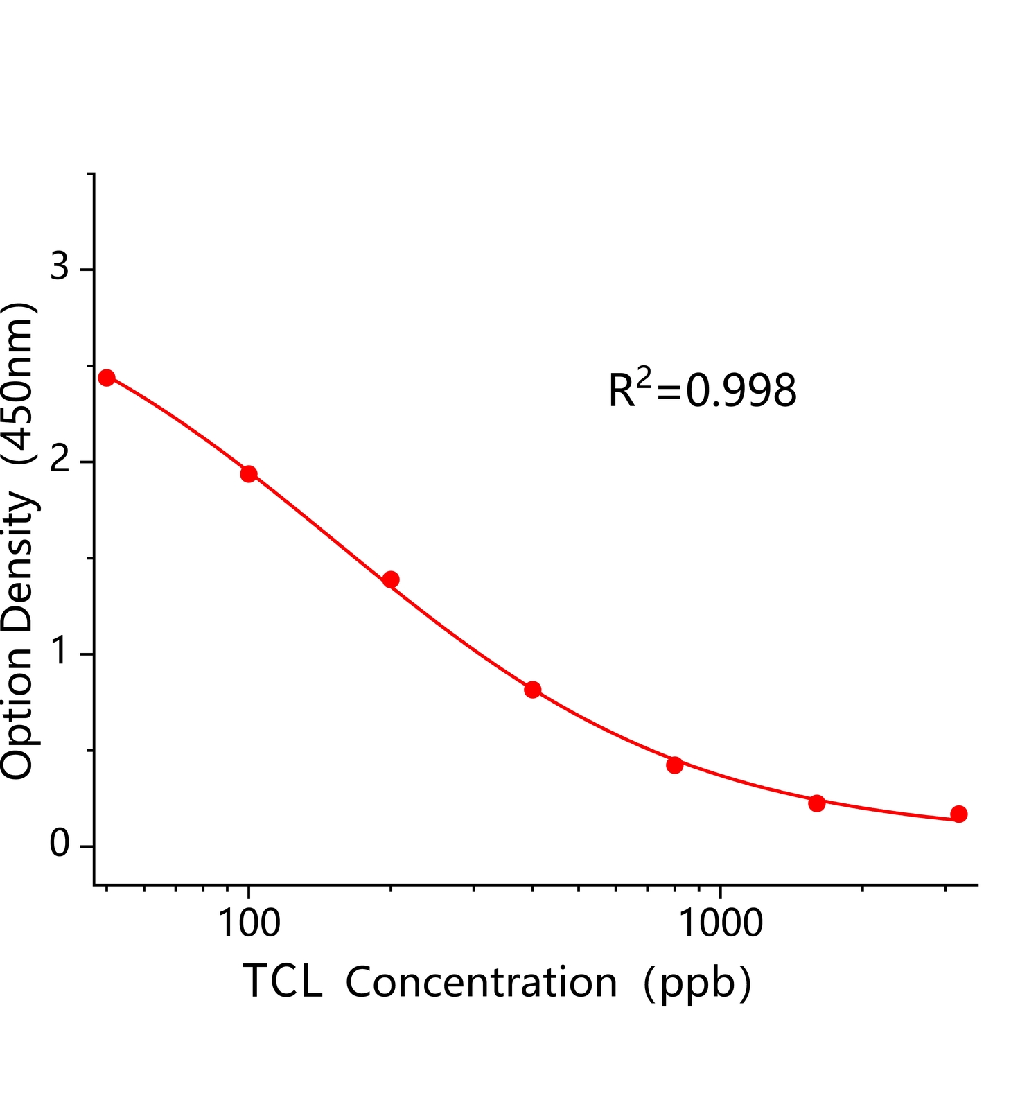 本试剂盒采用间接竞争ELISA方法,在酶标板微孔条上预包被偶联抗原,样本中替考拉宁和微孔条上预包被的偶联抗原竞争替考拉宁抗体,加入酶标二抗后,形成包被抗原-抗体-酶标二抗复合物。随后结合的酶催化TMB底物显色,样本吸光值与其含有的替考拉宁成负相关。通过标准曲线可准确定量样品中替考拉宁的含量。通过标准曲线计算所得值乘以样品处理的稀释倍数即为实际样品中替考拉宁的含量。