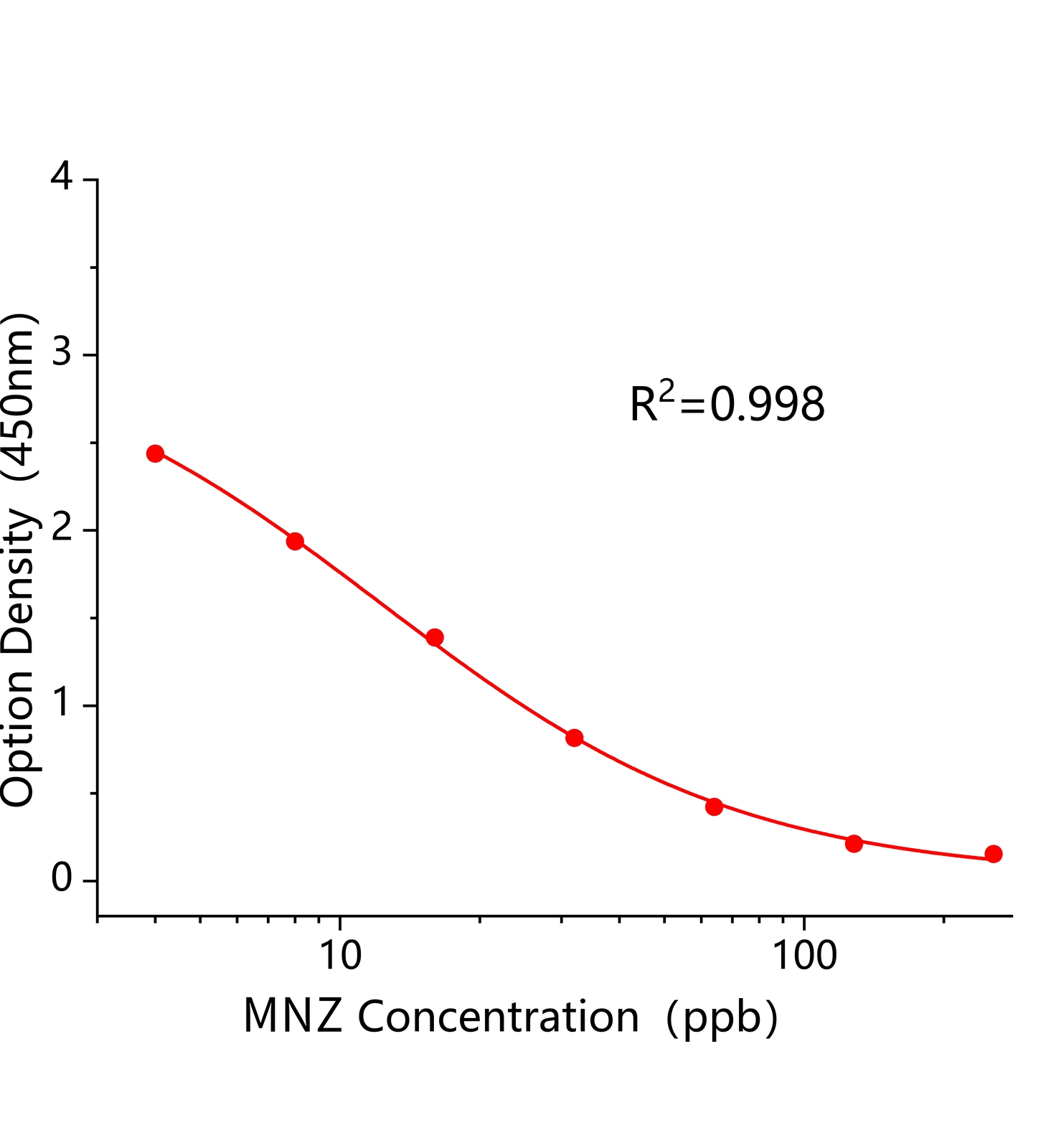 本试剂盒采用间接竞争ELISA方法,在酶标板微孔条上预包被偶联抗原,样本中甲硝唑和微孔条上预包被的偶联抗原竞争甲硝唑抗体,加入酶标二抗后,形成包被抗原-抗体-酶标二抗复合物。随后结合的酶催化TMB底物显色,样本吸光值与其含有的甲硝唑成负相关。通过标准曲线可准确定量样品中甲硝唑的含量。通过标准曲线计算所得值乘以样品处理的稀释倍数即为实际样品中甲硝唑的含量。