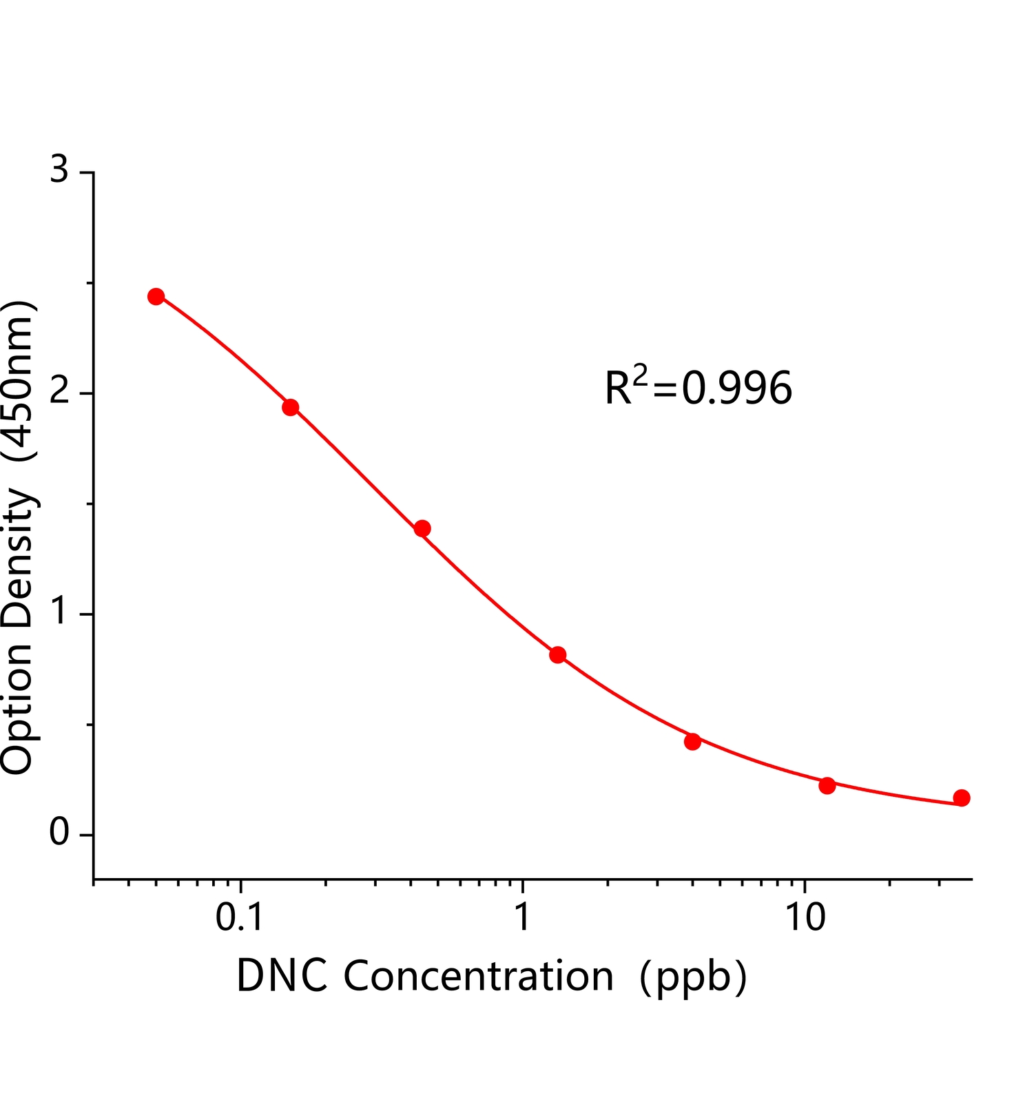 本试剂盒采用间接竞争ELISA方法,在酶标板微孔条上预包被偶联抗原,样本中DNC和微孔条上预包被的偶联抗原竞争DNC抗体,加入酶标二抗后,形成包被抗原-抗体-酶标二抗复合物。随后结合的酶催化TMB底物显色,样本吸光值与其含有的DNC成负相关。通过标准曲线可准确定量样品中DNC的含量。通过标准曲线计算所得值乘以样品处理的稀释倍数即为实际样品中DNC的含量。