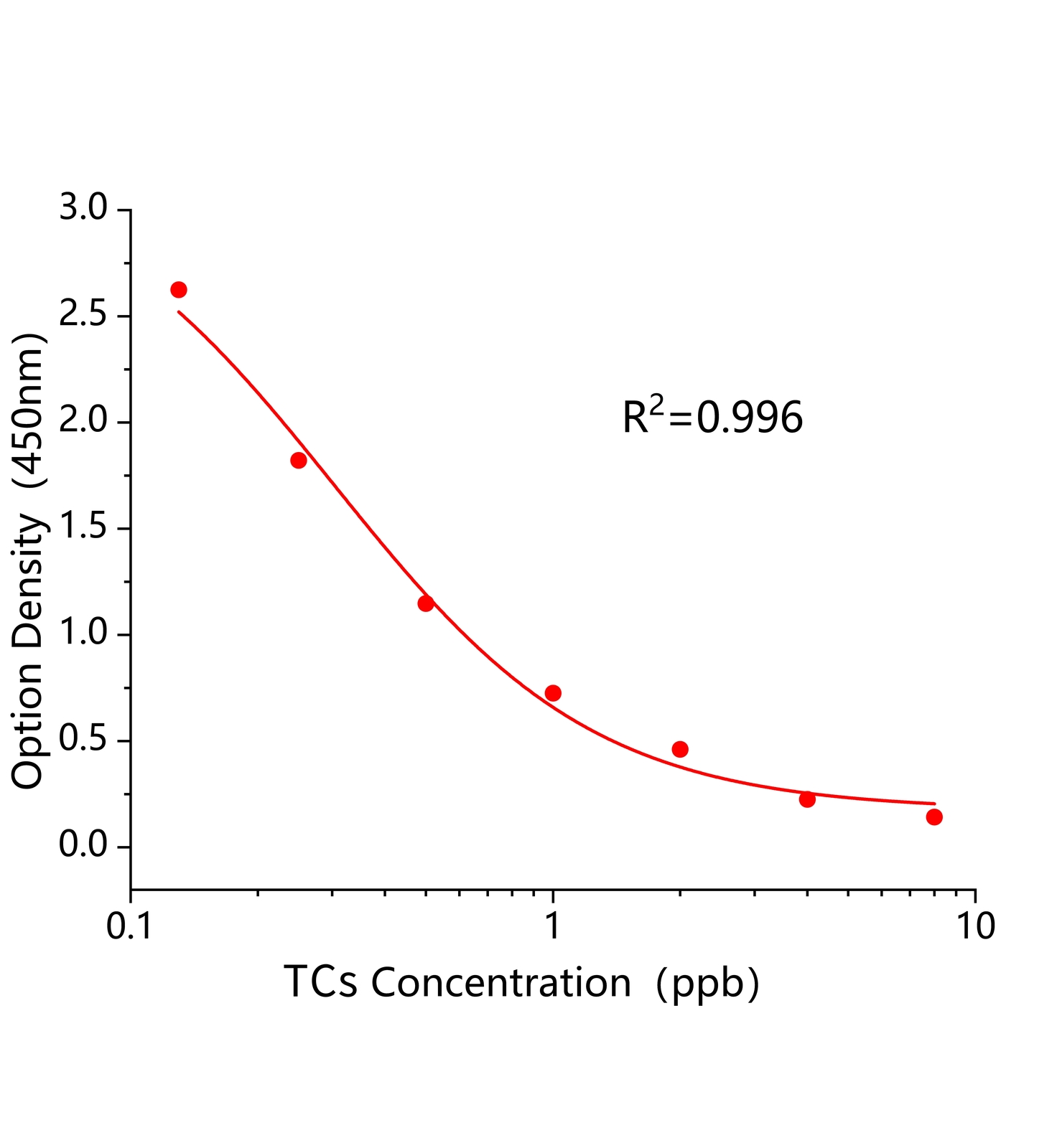 本试剂盒采用间接竞争ELISA方法,在酶标板微孔条上预包被偶联抗原,样本中四环素和微孔条上预包被的偶联抗原竞争四环素抗体,加入酶标二抗后,形成包被抗原-抗体-酶标二抗复合物。随后结合的酶催化TMB底物显色,样本吸光值与其含有的四环素成负相关,通过标准曲线可准确定量样品中四环素的含量。通过标准曲线计算所得值乘以样品处理的稀释倍数即为实际样品中四环素的含量。