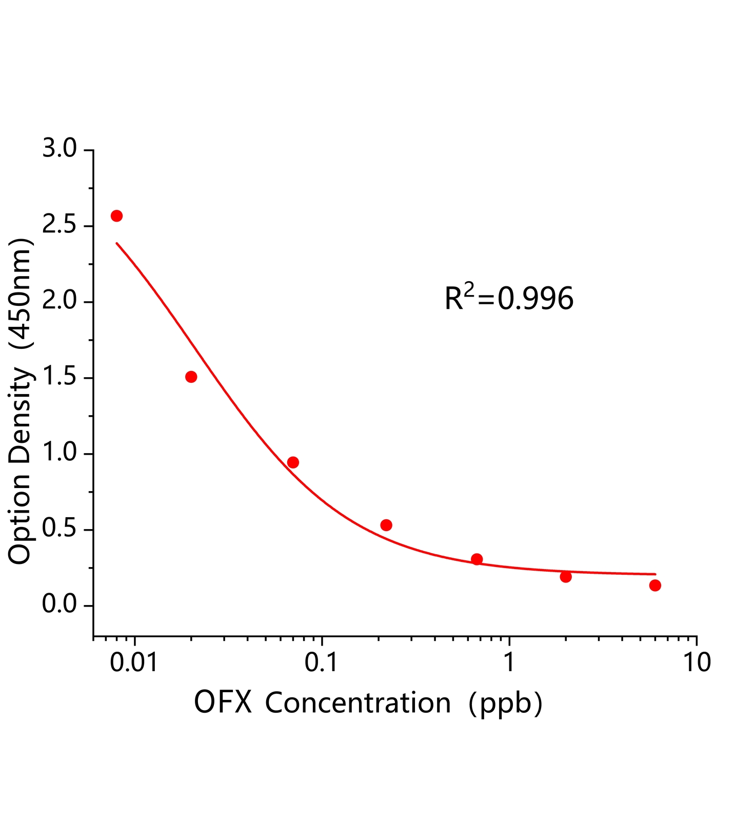 本试剂盒采用间接竞争ELISA方法,在酶标板微孔条上预包被偶联抗原,样本中OFX和微孔条上预包被的偶联抗原竞争OFX抗体,加入酶标二抗后,形成包被抗原-抗体-酶标二抗复合物。随后结合的酶催化TMB底物显色,样本吸光值与其含有的OFX成负相关。通过标准曲线可准确定量样品中OFX的含量。通过标准曲线计算所得值乘以样品处理的稀释倍数即为实际样品中OFX的含量。