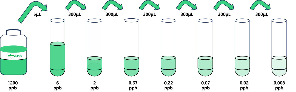 标准品配制:试剂盒中取出标准品,准备7个试管,先将1200ppb标准品(200µL)按需吸取一定量用1×稀释液稀释至6 ppb(例:5µL的标准品母液+995µL的1×稀释液,制备得到1000μL的6 ppb浓度标准品),随后在6个试管中分别加入600μL的1×稀释液,在这6个单独的试管中将6 ppb标准品依次3倍倍比稀释至6个梯度,共配制7个浓度的标准品,依次为:6 ppb、2ppb、0.67ppb、0.22ppb、0.07ppb、0.02ppb、0.008ppb,从最高浓度标准品溶液中吸取300μL标准品到下一个试管中,轻轻吹打混匀,以此类推进行标准品的倍比稀释(如图所示),1×稀释液用作零浓度标准品(0ppb)。