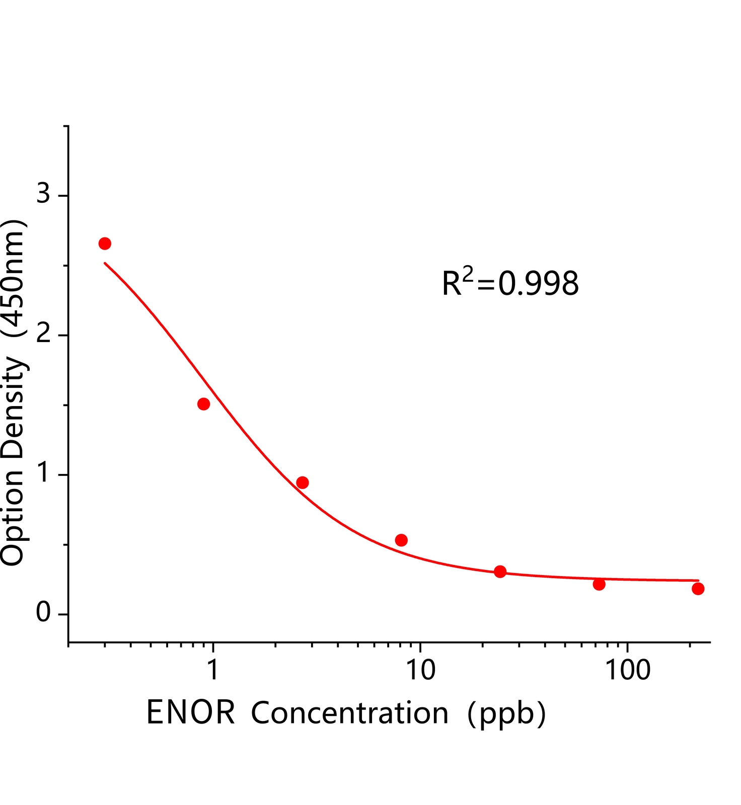 本试剂盒采用间接竞争ELISA方法,在酶标板微孔条上预包被偶联抗原,样本中ENOR和微孔条上预包被的偶联抗原竞争ENOR抗体,加入酶标二抗后,形成包被抗原-抗体-酶标二抗复合物。随后结合的酶催化TMB底物显色,样本吸光值与其含有的ENOR成负相关。通过标准曲线可准确定量样品中ENOR的含量。通过标准曲线计算所得值乘以样品处理的稀释倍数即为实际样品中ENOR的含量。