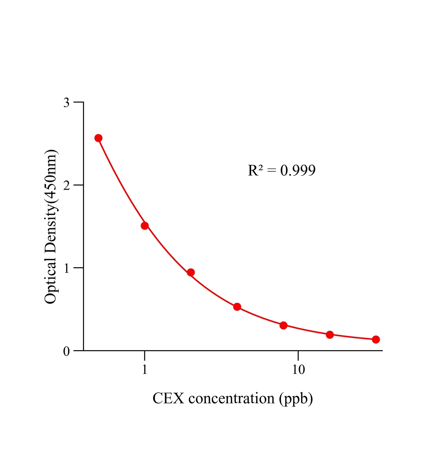 本试剂盒采用间接竞争ELISA方法,在酶标板微孔条上预包被偶联抗原,样本中CEX和微孔条上预包被的偶联抗原竞争CEX抗体,加入酶标二抗后,形成包被抗原-抗体-酶标二抗复合物。随后结合的酶催化TMB底物显色,样本吸光值与其含有的CEX成负相关。通过标准曲线可准确定量样品中CEX的含量。通过标准曲线计算所得值乘以样品处理的稀释倍数即为实际样品中CEX的含量。