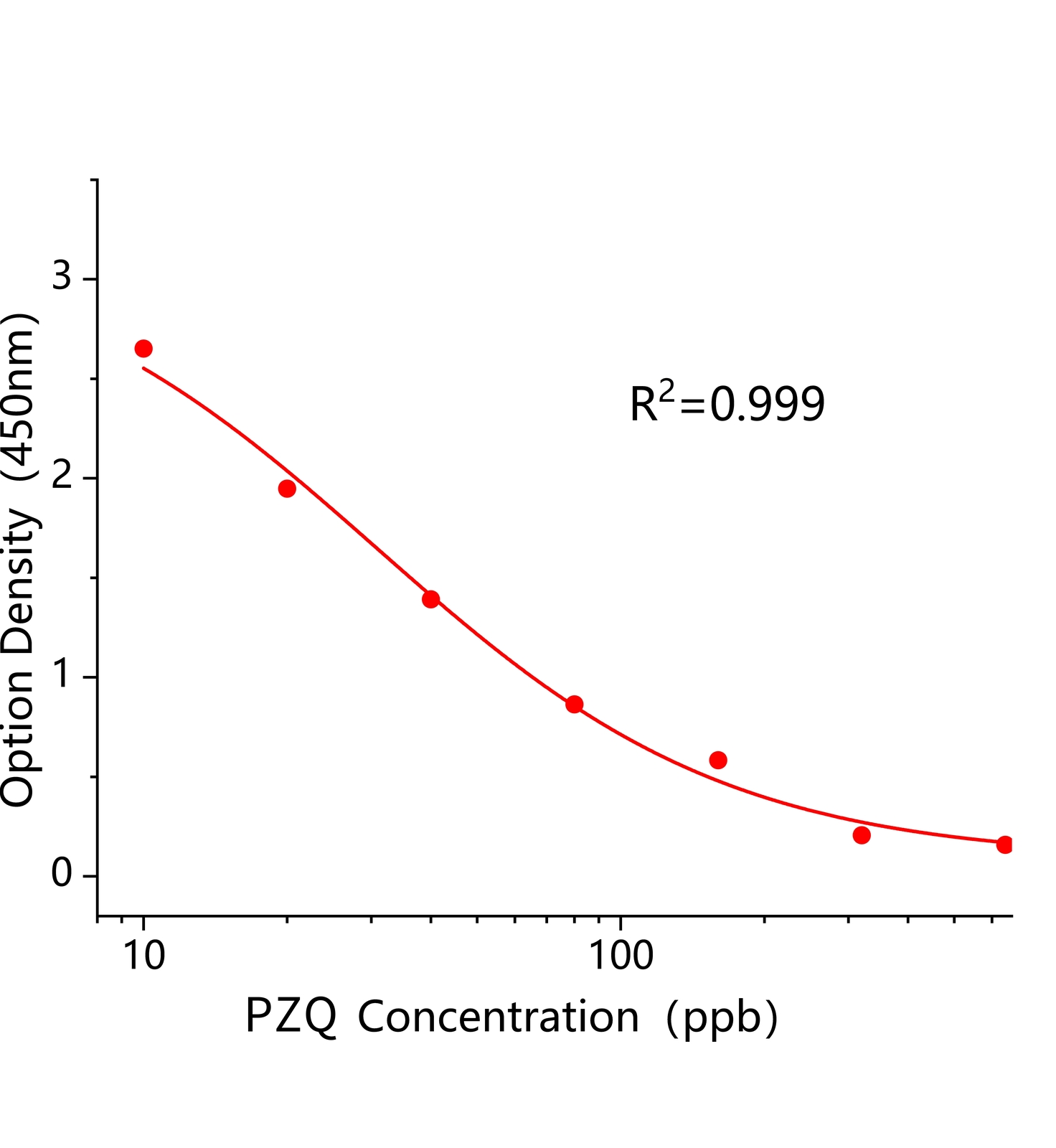 本试剂盒采用间接竞争ELISA方法,在酶标板微孔条上预包被偶联抗原,样本中吡喹酮和微孔条上预包被的偶联抗原竞争吡喹酮抗体,加入酶标二抗后,形成包被抗原-抗体-酶标二抗复合物。随后结合的酶催化TMB底物显色,样本吸光值与其含有的吡喹酮成负相关。通过标准曲线可准确定量样品中吡喹酮的含量。通过标准曲线计算所得值乘以样品处理的稀释倍数即为实际样品中吡喹酮的含量。