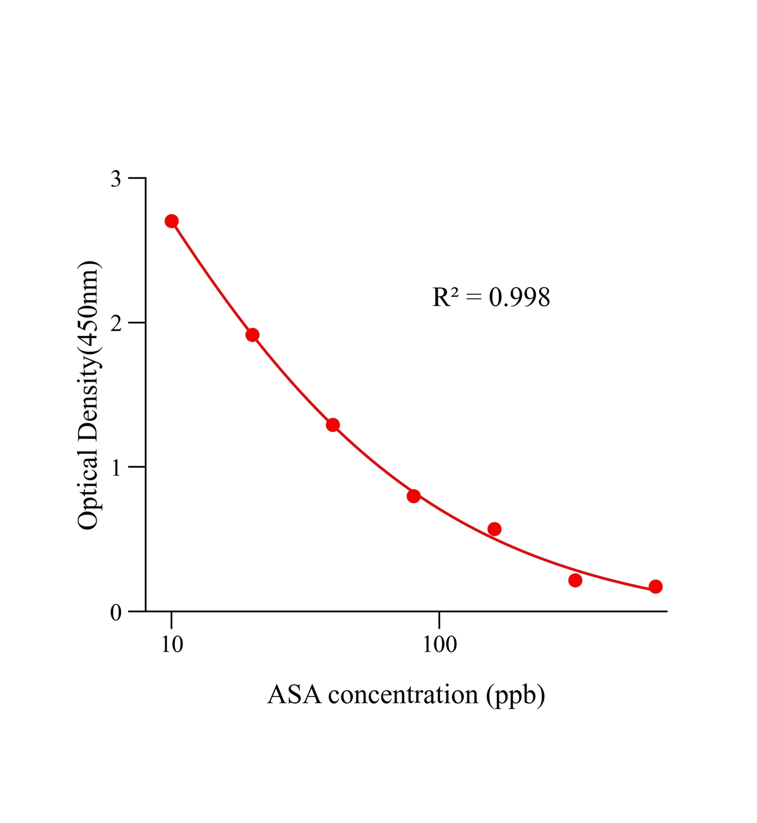 本试剂盒采用间接竞争ELISA方法,在酶标板微孔条上预包被偶联抗原,样本中阿散酸和微孔条上预包被的偶联抗原竞争阿散酸抗体,加入酶标二抗后,形成包被抗原-抗体-酶标二抗复合物。随后结合的酶催化TMB底物显色,样本吸光值与其含有的阿散酸成负相关。通过标准曲线可准确定量样品中阿散酸的含量。通过标准曲线计算所得值乘以样品处理的稀释倍数即为实际样品中阿散酸的含量。