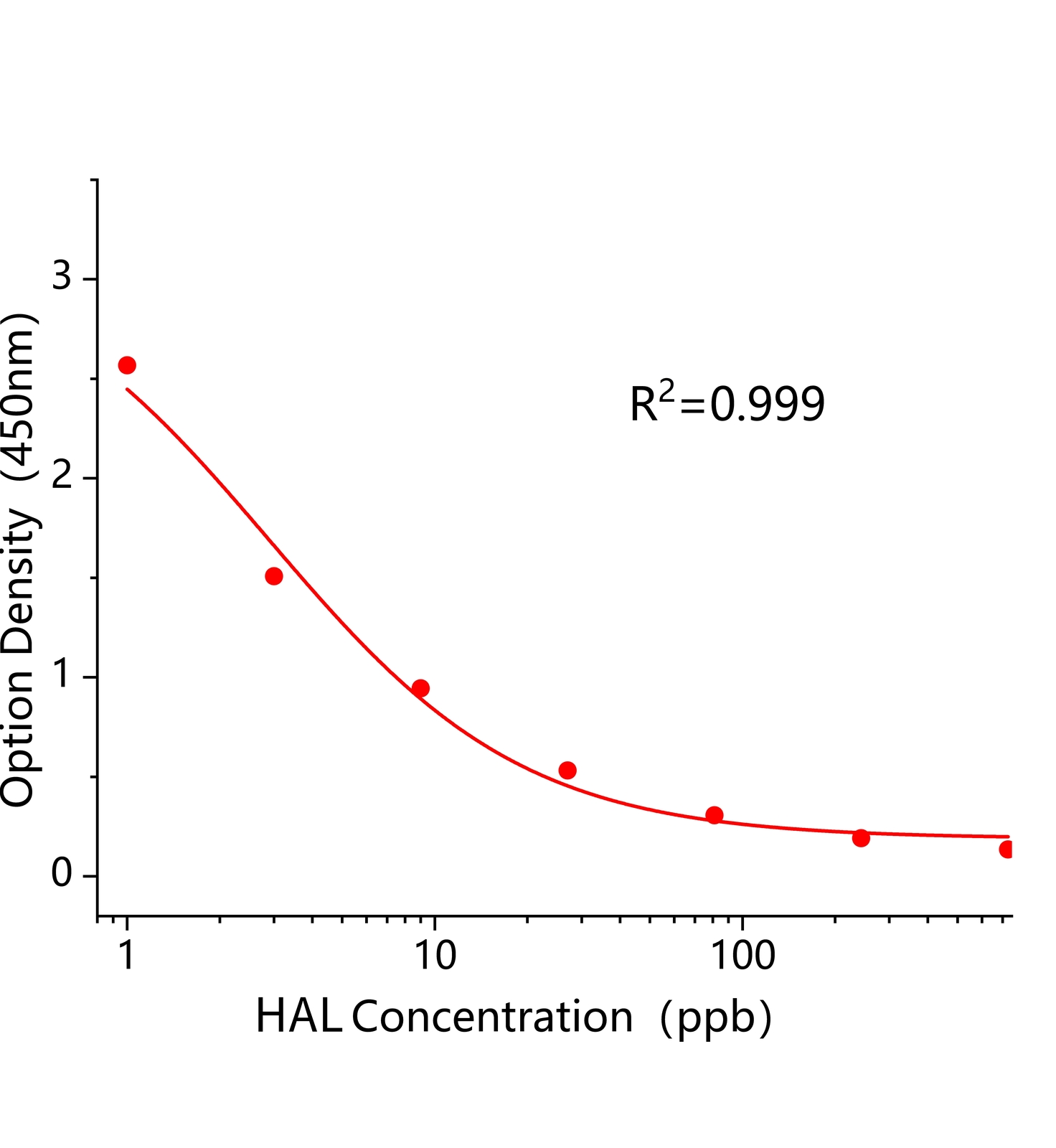 本试剂盒采用间接竞争ELISA方法,在酶标板微孔条上预包被偶联抗原,样本中HAL和微孔条上预包被的偶联抗原竞争HAL抗体,加入酶标二抗后,形成包被抗原-抗体-酶标二抗复合物。随后结合的酶催化TMB底物显色,样本吸光值与其含有的HAL成负相关。通过标准曲线可准确定量样品中HAL的含量。通过标准曲线计算所得值乘以样品处理的稀释倍数即为实际样品中HAL的含量。