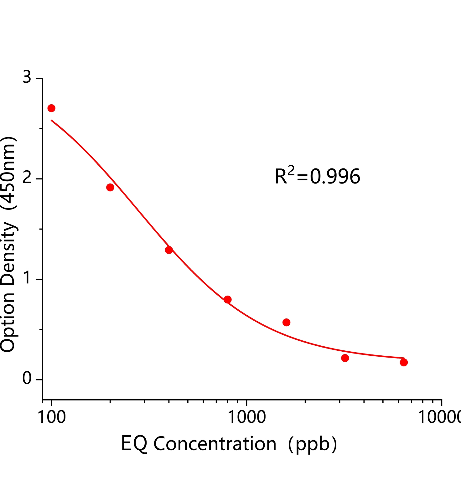 本试剂盒采用间接竞争ELISA方法,在酶标板微孔条上预包被偶联抗原,样本中乙氧基喹啉和微孔条上预包被的偶联抗原竞争乙氧基喹啉抗体,加入酶标二抗后,形成包被抗原-抗体-酶标二抗复合物。随后结合的酶催化TMB底物显色,样本吸光值与其含有的乙氧基喹啉成负相关。通过标准曲线可准确定量样品中乙氧基喹啉的含量。通过标准曲线计算所得值乘以样品处理的稀释倍数即为实际样品中乙氧基喹啉的含量。