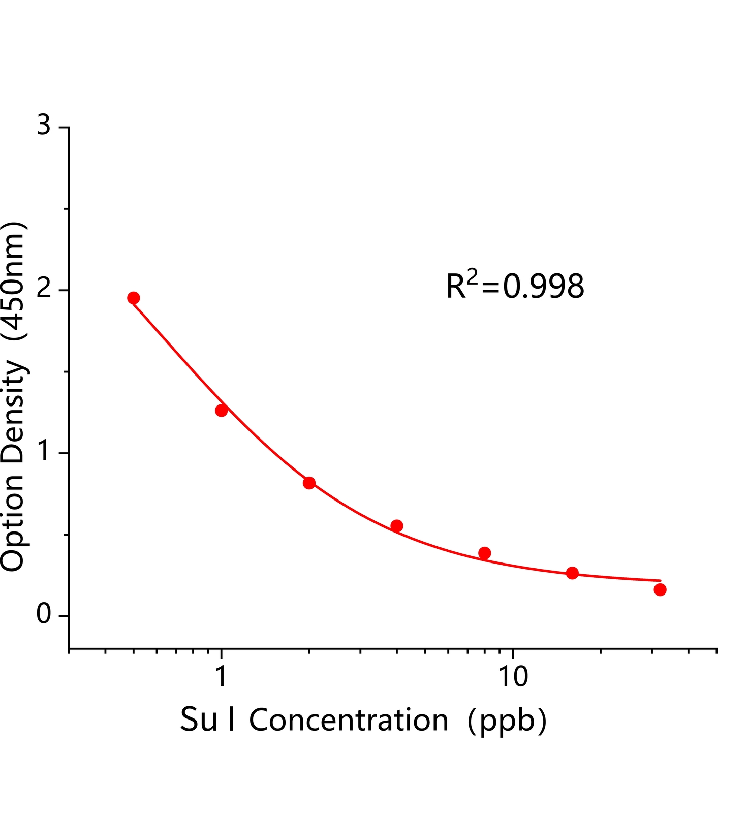 本试剂盒采用间接竞争ELISA方法,在酶标板微孔条上预包被偶联抗原,样本中SU I和微孔条上预包被的偶联抗原竞争SU I抗体,加入酶标二抗后,形成包被抗原-抗体-酶标二抗复合物。随后结合的酶催化TMB底物显色,样本吸光值与其含有的SU I成负相关。通过标准曲线可准确定量样品中SU I的含量。通过标准曲线计算所得值乘以样品处理的稀释倍数即为实际样品中SU I的含量。