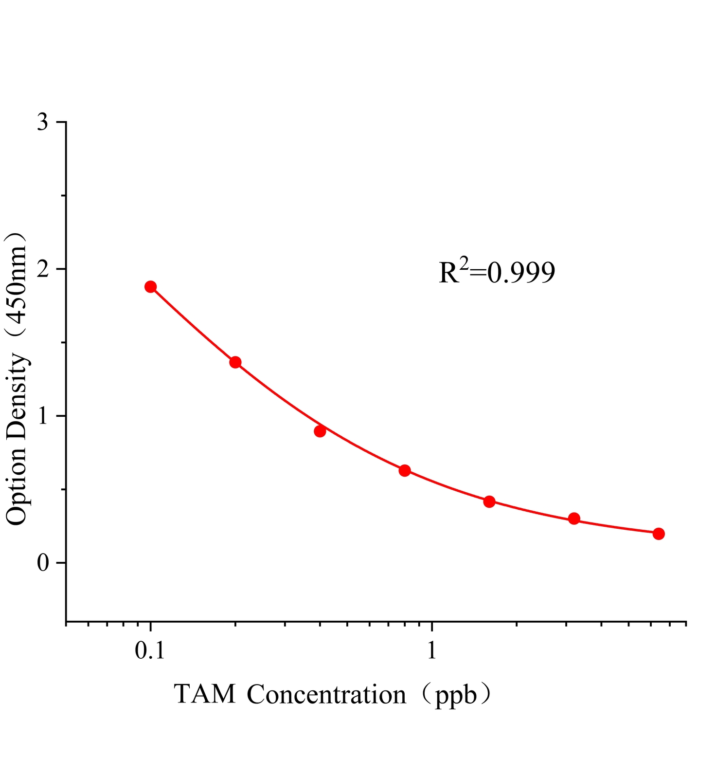 本试剂盒采用间接竞争ELISA方法,在酶标板微孔条上预包被偶联抗原,样本中三氮脒和微孔条上预包被的偶联抗原竞争三氮脒抗体,加入酶标二抗后,形成包被抗原-抗体-酶标二抗复合物。随后结合的酶催化TMB底物显色,样本吸光值与其含有的三氮脒成负相关。通过标准曲线可准确定量样品中三氮脒的含量。通过标准曲线计算所得值乘以样品处理的稀释倍数即为实际样品中三氮脒的含量。
