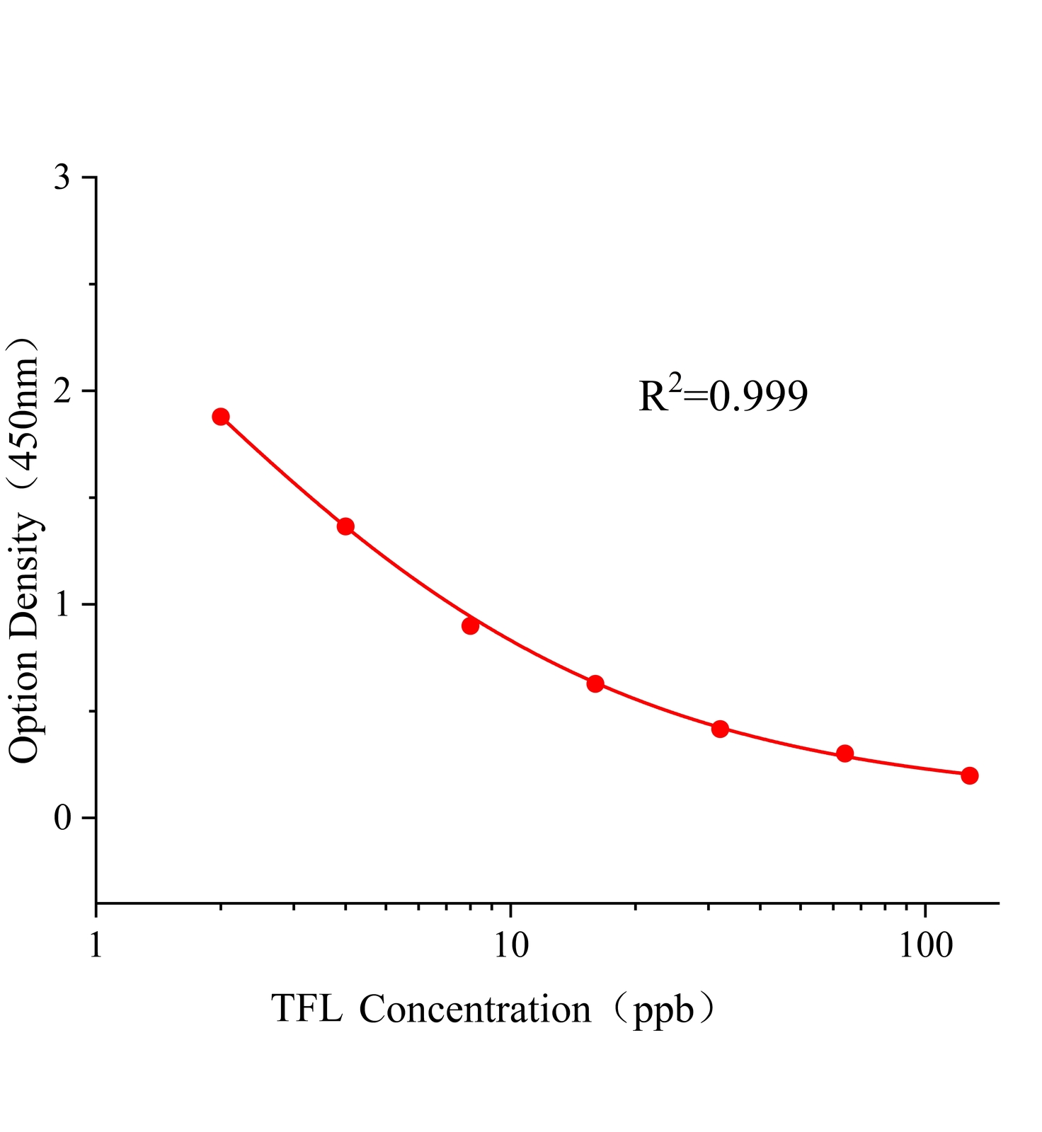本试剂盒采用间接竞争ELISA方法,在酶标板微孔条上预包被偶联抗原,样本中氟乐灵和微孔条上预包被的偶联抗原竞争氟乐灵抗体,加入酶标二抗后,形成包被抗原-抗体-酶标二抗复合物。随后结合的酶催化TMB底物显色,样本吸光值与其含有的氟乐灵成负相关。通过标准曲线可准确定量样品中氟乐灵的含量。通过标准曲线计算所得值乘以样品处理的稀释倍数即为实际样品中氟乐灵的含量。