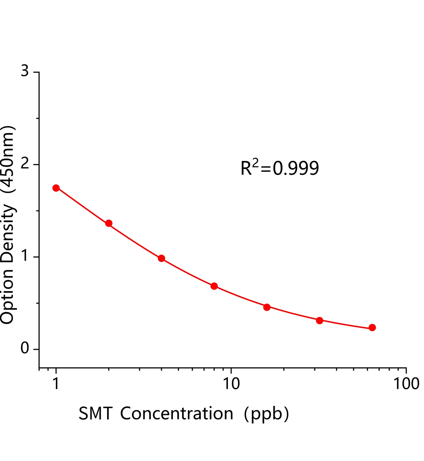 本试剂盒采用间接竞争ELISA方法,在酶标板微孔条上预包被偶联抗原,样本中嘧磺隆和微孔条上预包被的偶联抗原竞争嘧磺隆抗体,加入酶标二抗后,形成包被抗原-抗体-酶标二抗复合物。随后结合的酶催化TMB底物显色,样本吸光值与其含有的嘧磺隆成负相关。通过标准曲线可准确定量样品中嘧磺隆的含量。通过标准曲线计算所得值乘以样品处理的稀释倍数即为实际样品中嘧磺隆的含量。