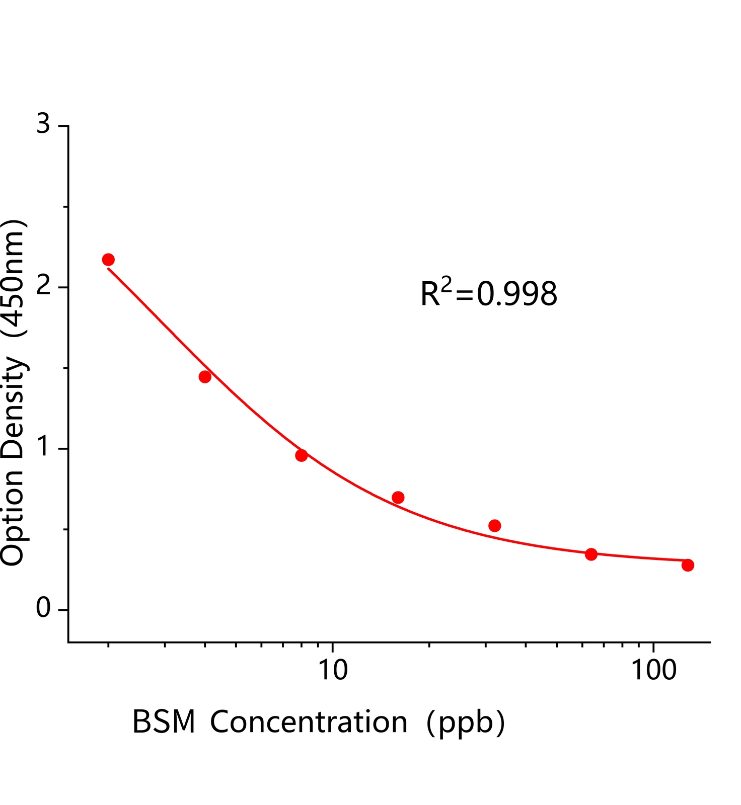 本试剂盒采用间接竞争ELISA方法,在酶标板微孔条上预包被偶联抗原,样本中苄嘧磺隆和微孔条上预包被的偶联抗原竞争苄嘧磺隆抗体,加入酶标二抗后,形成包被抗原-抗体-酶标二抗复合物。随后结合的酶催化TMB底物显色,样本吸光值与其含有的苄嘧磺隆成负相关。通过标准曲线可准确定量样品中苄嘧磺隆的含量。通过标准曲线计算所得值乘以样品处理的稀释倍数即为实际样品中苄嘧磺隆的含量。