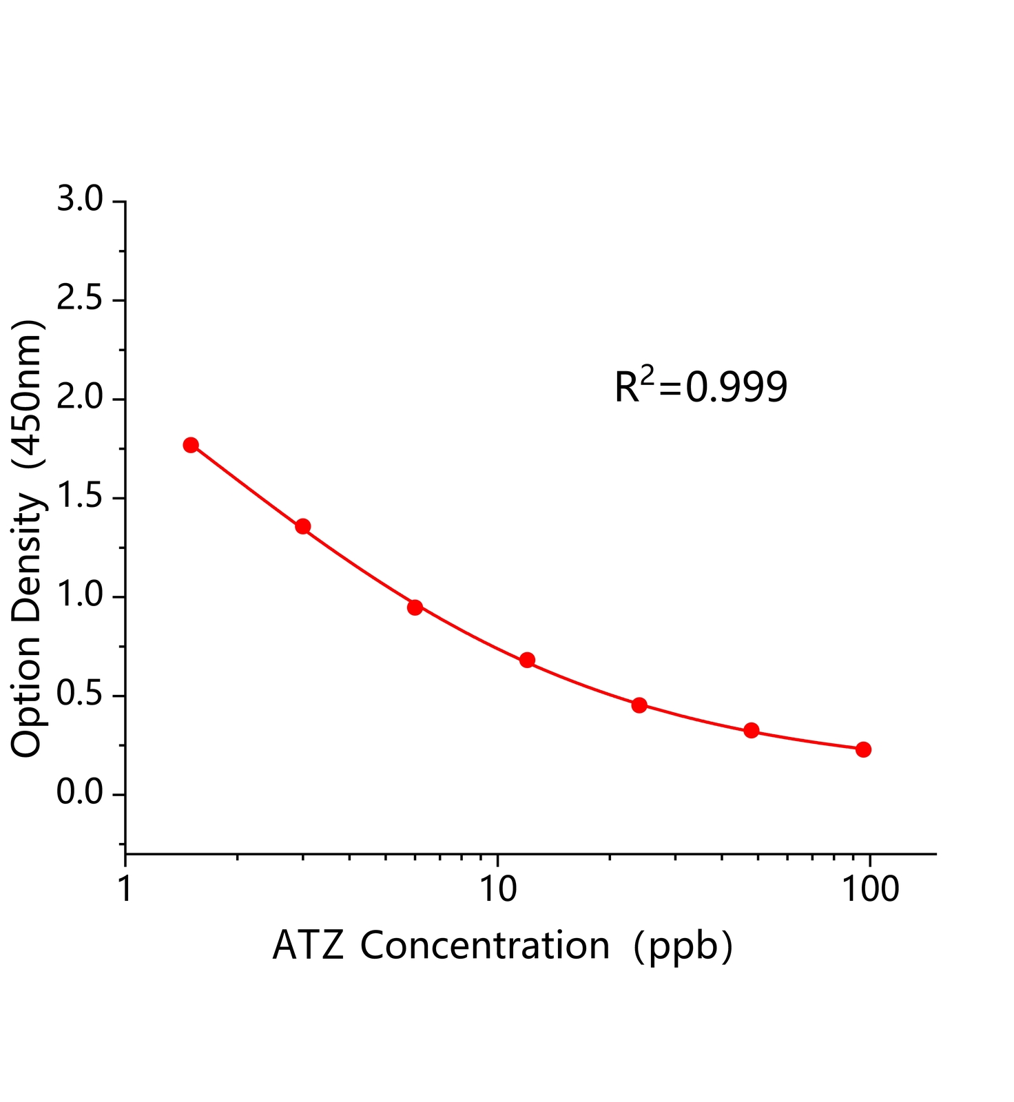 本试剂盒采用间接竞争ELISA方法,在酶标板微孔条上预包被偶联抗原,样本中ATZ和微孔条上预包被的偶联抗原竞争ATZ抗体,加入酶标二抗后,形成包被抗原-抗体-酶标二抗复合物。随后结合的酶催化TMB底物显色,样本吸光值与其含有的ATZ成负相关。通过标准曲线可准确定量样品中ATZ的含量。通过标准曲线计算所得值乘以样品处理的稀释倍数即为实际样品中ATZ的含量。