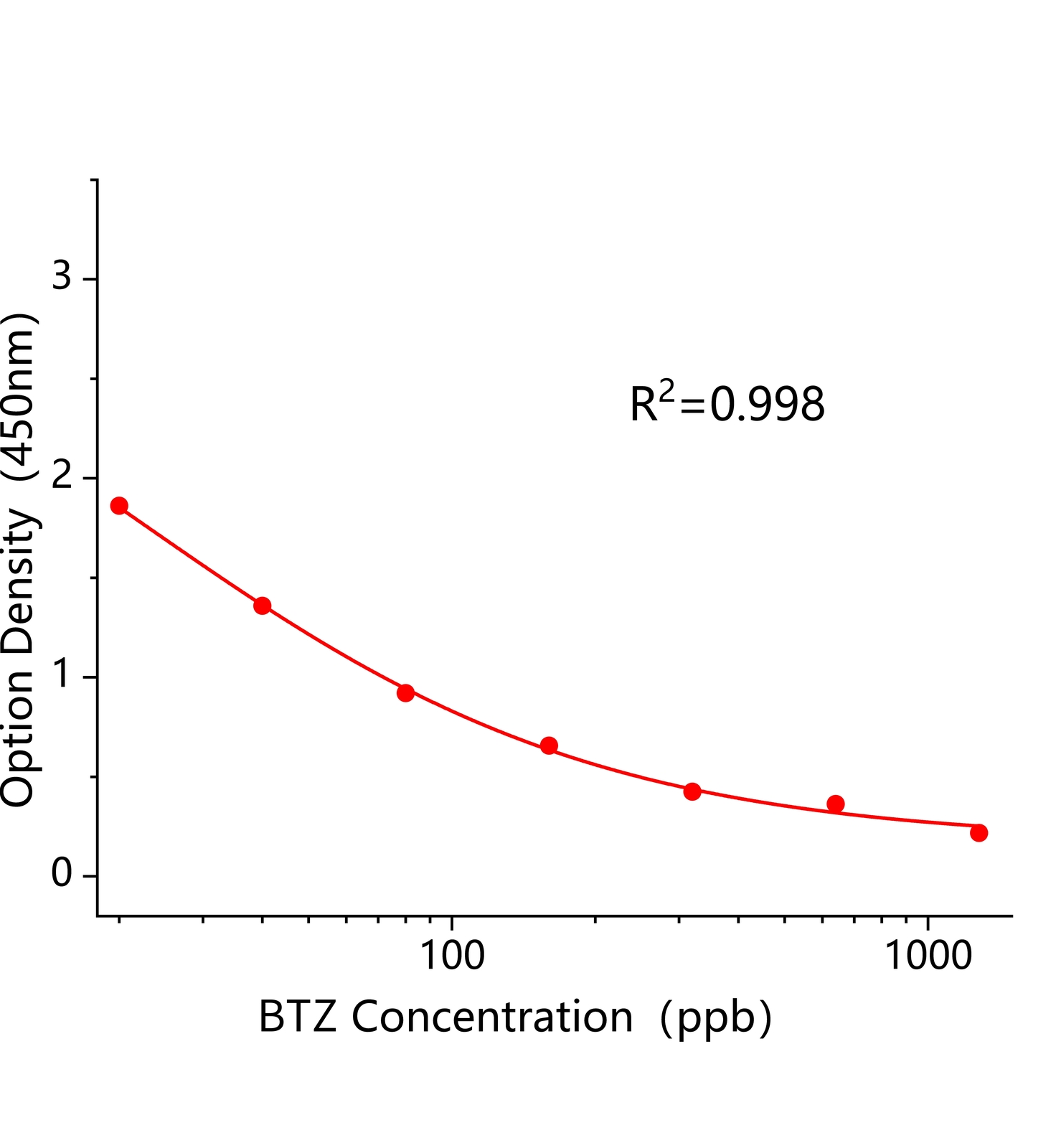 本试剂盒采用间接竞争ELISA方法,在酶标板微孔条上预包被偶联抗原,样本中灭草松和微孔条上预包被的偶联抗原竞争灭草松抗体,加入酶标二抗后,形成包被抗原-抗体-酶标二抗复合物。随后结合的酶催化TMB底物显色,样本吸光值与其含有的灭草松成负相关。通过标准曲线可准确定量样品中灭草松的含量。通过标准曲线计算所得值乘以样品处理的稀释倍数即为实际样品中灭草松的含量。
