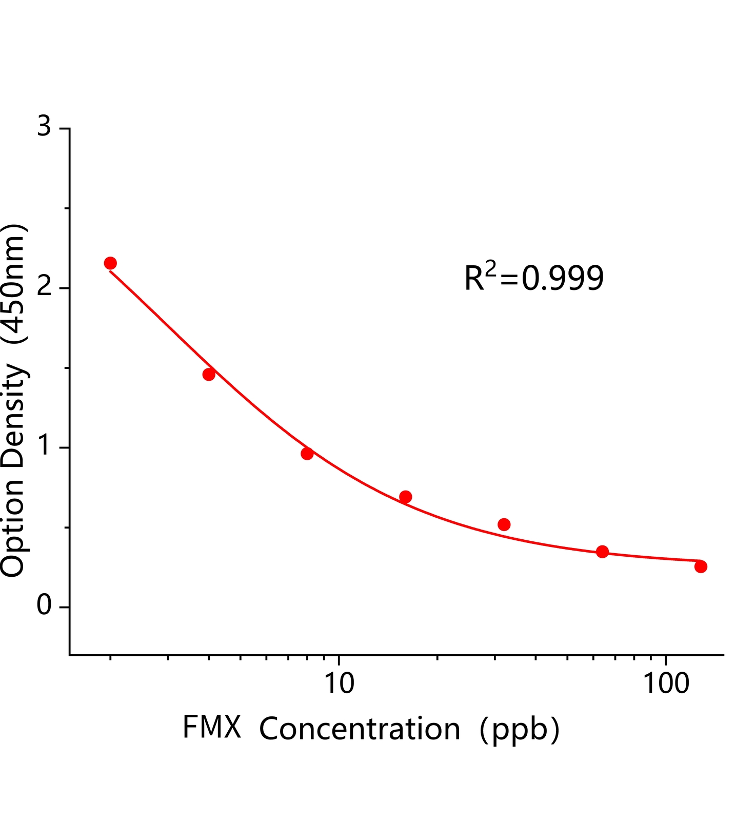 本试剂盒采用间接竞争ELISA方法,在酶标板微孔条上预包被偶联抗原,样本中FMX和微孔条上预包被的偶联抗原竞争FMX抗体,加入酶标二抗后,形成包被抗原-抗体-酶标二抗复合物。随后结合的酶催化TMB底物显色,样本吸光值与其含有的FMX成负相关。通过标准曲线可准确定量样品中FMX的含量。通过标准曲线计算所得值乘以样品处理的稀释倍数即为实际样品中FMX的含量。