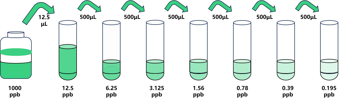 标准品配制:试剂盒中取出标准品,准备7个试管,先将1000ppb标准品(200µL)按需吸取一定量用1×稀释液稀释至12.5ppb(例:12.5µL的标准品母液+987.5µL的1×稀释液,制备得到1000μL的12.5ppb浓度标准品),随后在7个试管中分别加入500μL的1×稀释液,在这7个单独的试管中将12.5ppb标准品依次2倍倍比稀释至7个梯度,共配制7个浓度的标准品,依次为:12.5ppb、6.25ppb、3.125ppb、1.56ppb、0.780ppb、0.390ppb、0.195ppb,从最高浓度标准品溶液中吸取500μL标准品到下一个试管中,轻轻吹打混匀,以此类推进行标准品的倍比稀释(如图所示),1×稀释液用作零浓度标准品(0ppb)。