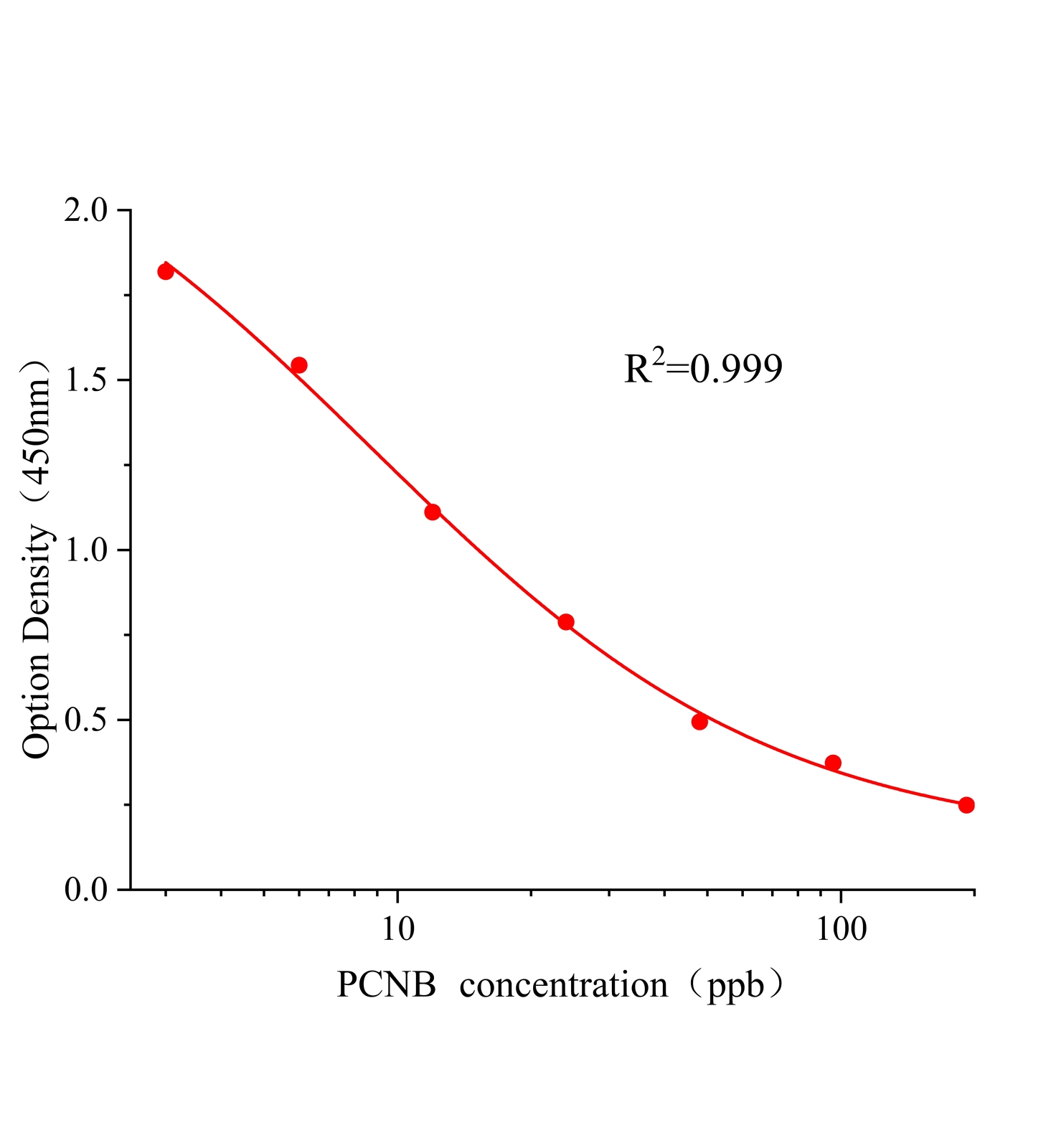 本试剂盒采用间接竞争ELISA方法,在酶标板微孔条上预包被偶联抗原,样本中PCNB和微孔条上预包被的偶联抗原竞争PCNB抗体,加入酶标二抗后,形成包被抗原-抗体-酶标二抗复合物。随后结合的酶催化TMB底物显色,样本吸光值与其含有的PCNB成负相关。通过标准曲线可准确定量样品中PCNB的含量。通过标准曲线计算所得值乘以样品处理的稀释倍数即为实际样品中PCNB的含量。