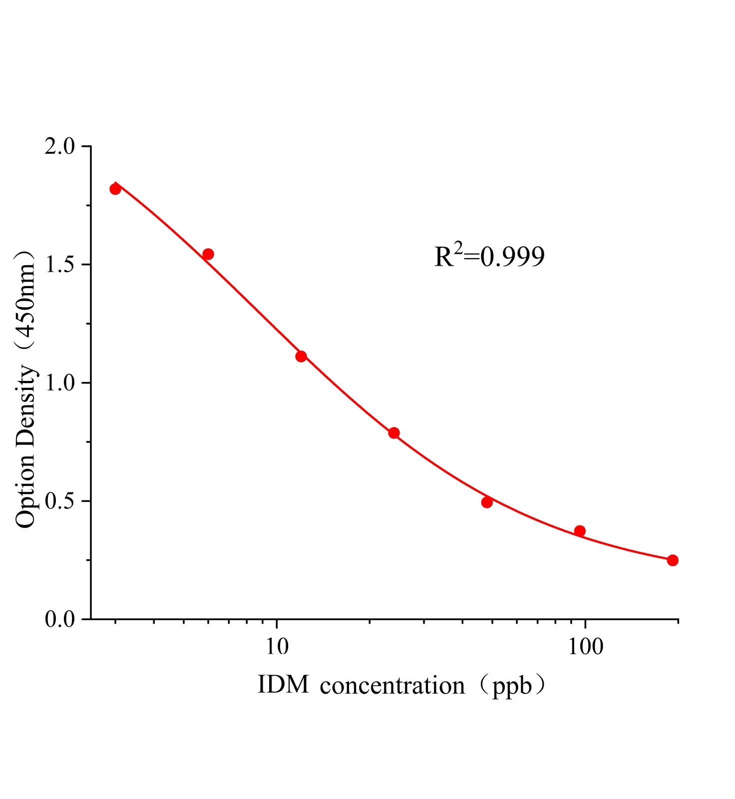 本试剂盒采用间接竞争ELISA方法,在酶标板微孔条上预包被偶联抗原,样本中IDM和微孔条上预包被的偶联抗原竞争IDM抗体,加入酶标二抗后,形成包被抗原-抗体-酶标二抗复合物。随后结合的酶催化TMB底物显色,样本吸光值与其含有的IDM成负相关。通过标准曲线可准确定量样品中IDM的含量。通过标准曲线计算所得值乘以样品处理的稀释倍数即为实际样品中IDM的含量。