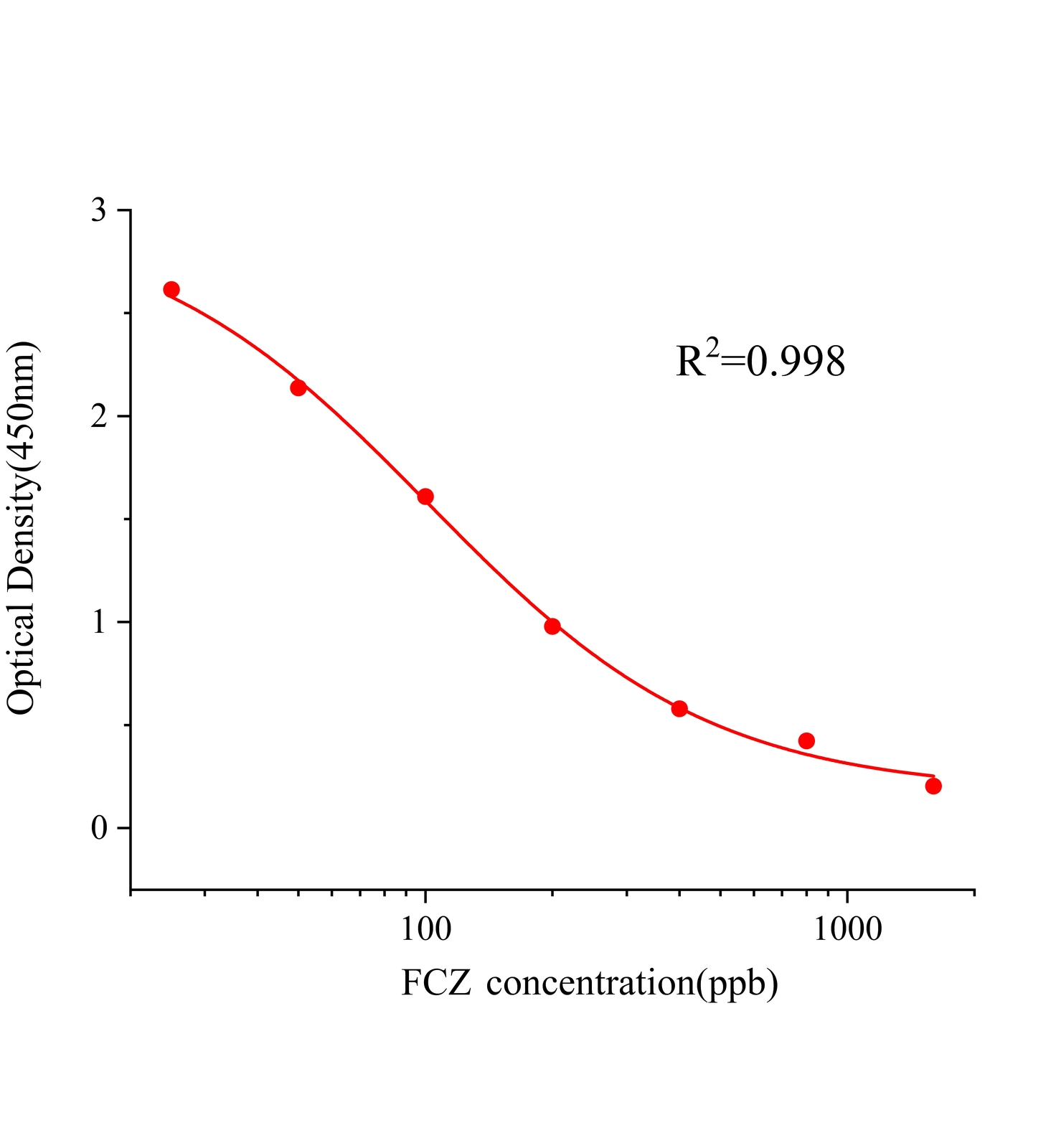 本试剂盒采用间接竞争ELISA方法,在酶标板微孔条上预包被偶联抗原,样本中FCZ和微孔条上预包被的偶联抗原竞争FCZ抗体,加入酶标二抗后,形成包被抗原-抗体-酶标二抗复合物。随后结合的酶催化TMB底物显色,样本吸光值与其含有的FCZ成负相关。通过标准曲线可准确定量样品中FCZ的含量。通过标准曲线计算所得值乘以样品处理的稀释倍数即为实际样品中FCZ的含量。