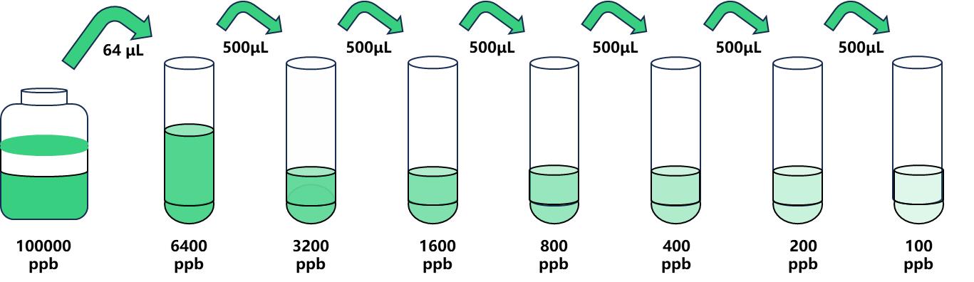 标准品配制:试剂盒中取出标准品,准备7个试管,先将100000 ppb标准品(200µL)按需吸取一定量用1×稀释液稀释至6400 ppb(例:64µL的标准品母液+936µL的1×稀释液,制备得到1000μL的6400 ppb浓度标准品),随后在6个试管中分别加入500μL的1×稀释液,在这6个单独的试管中将6400 ppb标准品依次2倍倍比稀释至6个梯度,共配制7个浓度的标准品,依次为:6400 ppb、3200 ppb、1600 ppb、800 ppb、400 ppb、200 ppb、100 ppb,从最高浓度标准品溶液中吸取500μL标准品到下一个试管中,轻轻吹打混匀,以此类推进行标准品的倍比稀释(如图所示),1×稀释液用作零浓度标准品(0ppb)。