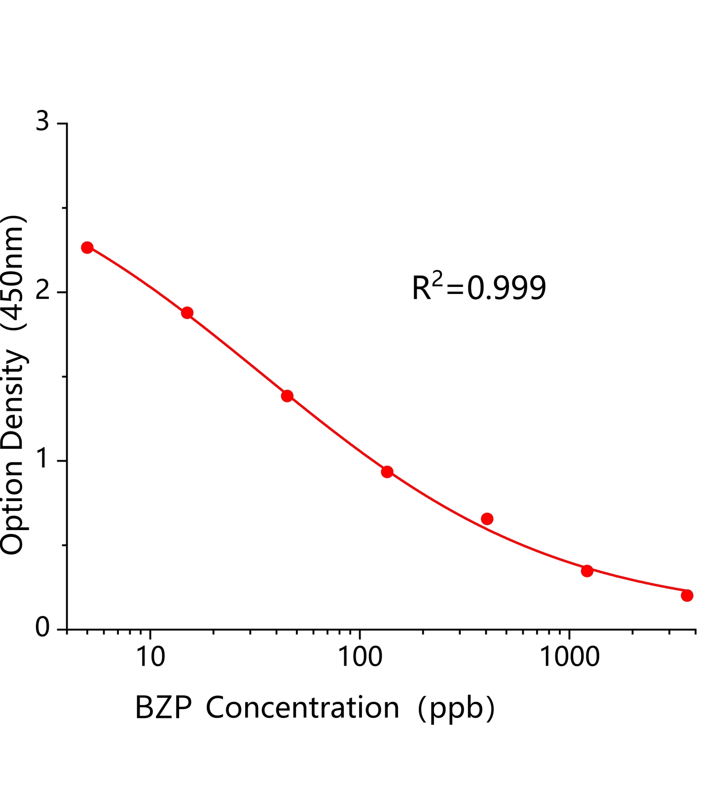 本试剂盒采用间接竞争ELISA方法,在酶标板微孔条上预包被偶联抗原,样本中BZP和微孔条上预包被的偶联抗原竞争BZP抗体,加入酶标二抗后,形成包被抗原-抗体-酶标二抗复合物。随后结合的酶催化TMB底物显色,样本吸光值与其含有的BZP成负相关。通过标准曲线可准确定量样品中BZP的含量。通过标准曲线计算所得值乘以样品处理的稀释倍数即为实际样品中BZP的含量。