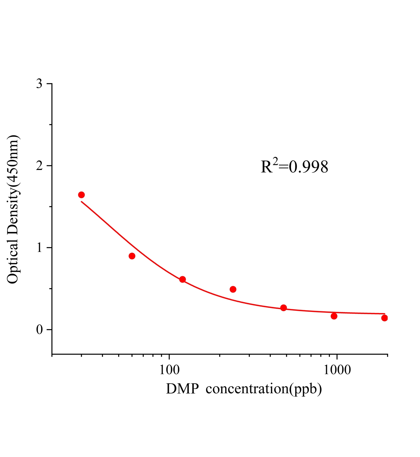 本试剂盒采用间接竞争ELISA方法,在酶标板微孔条上预包被偶联抗原,样本中DMP和微孔条上预包被的偶联抗原竞争DMP抗体,加入酶标二抗后,形成包被抗原-抗体-酶标二抗复合物。随后结合的酶催化TMB底物显色,样本吸光值与其含有的DMP成负相关。通过标准曲线可准确定量样品中DMP的含量。通过标准曲线计算所得值乘以样品处理的稀释倍数即为实际样品中DMP的含量。