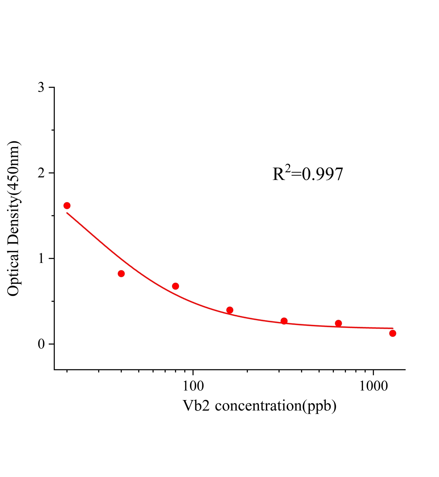 本试剂盒采用间接竞争ELISA方法,在酶标板微孔条上预包被偶联抗原,样本中VB2和微孔条上预包被的偶联抗原竞争VB2抗体,加入酶标二抗后,形成包被抗原-抗体-酶标二抗复合物。随后结合的酶催化TMB底物显色,样本吸光值与其含有的VB2成负相关。通过标准曲线可准确定量样品中VB2的含量。通过标准曲线计算所得值乘以样品处理的稀释倍数即为实际样品中VB2的含量。