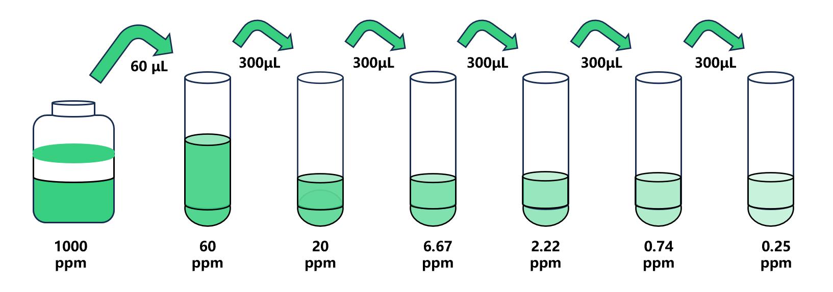 标准品配制:试剂盒中取出标准品,准备7个试管,先将1000 ppm标准品(200µL)按需吸取一定量用1×稀释液稀释至60ppm(例:60µL的标准品母液+940µL的1×稀释液,制备得到1000μL的60ppm浓度标准品),随后在5个试管中分别加入600μL的1×稀释液,在这5个单独的试管中将60ppm标准品依次3倍倍比稀释至5个梯度,共配制6个浓度的标准品,依次为:60 ppm、20ppm、6.67ppm、2.22ppm、0.74ppm、0.25ppm,从最高浓度标准品溶液中吸取300μL标准品到下一个试管中,轻轻吹打混匀,以此类推进行标准品的倍比稀释(如图所示),1×稀释液用作零浓度标准品(0ppm)。