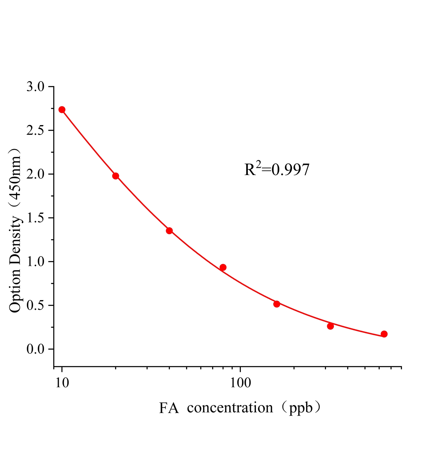 本试剂盒采用间接竞争ELISA方法,在酶标板微孔条上预包被偶联抗原,样本中FA和微孔条上预包被的偶联抗原竞争FA抗体,加入酶标二抗后,形成包被抗原-抗体-酶标二抗复合物。随后结合的酶催化TMB底物显色,样本吸光值与其含有的FA成负相关。通过标准曲线可准确定量样品中FA的含量。通过标准曲线计算所得值乘以样品处理的稀释倍数即为实际样品中FA的含量。