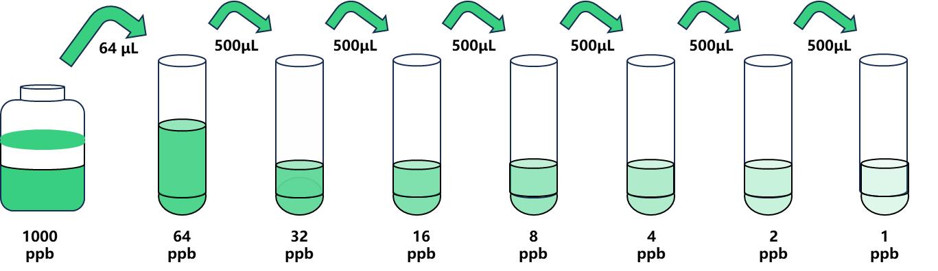 标准品配制:试剂盒中取出标准品,准备7个试管,先将1000 ppb标准品(200µL)按需吸取一定量用1×稀释液稀释至64 ppb(例:64µL的标准品母液+936µL的1×稀释液,制备得到1000μL的64 ppb浓度标准品),随后在6个试管中分别加入500μL的1×稀释液,在这6个单独的试管中将64 ppb标准品依次2倍倍比稀释至6个梯度,共配制7个浓度的标准品,依次为:64 ppb、32 ppb、16 ppb、8 ppb、4 ppb、2 ppb、1 ppb,从最高浓度标准品溶液中吸取500μL标准品到下一个试管中,轻轻吹打混匀,以此类推进行标准品的倍比稀释(如图所示),1×稀释液用作零浓度标准品(0ppb)。