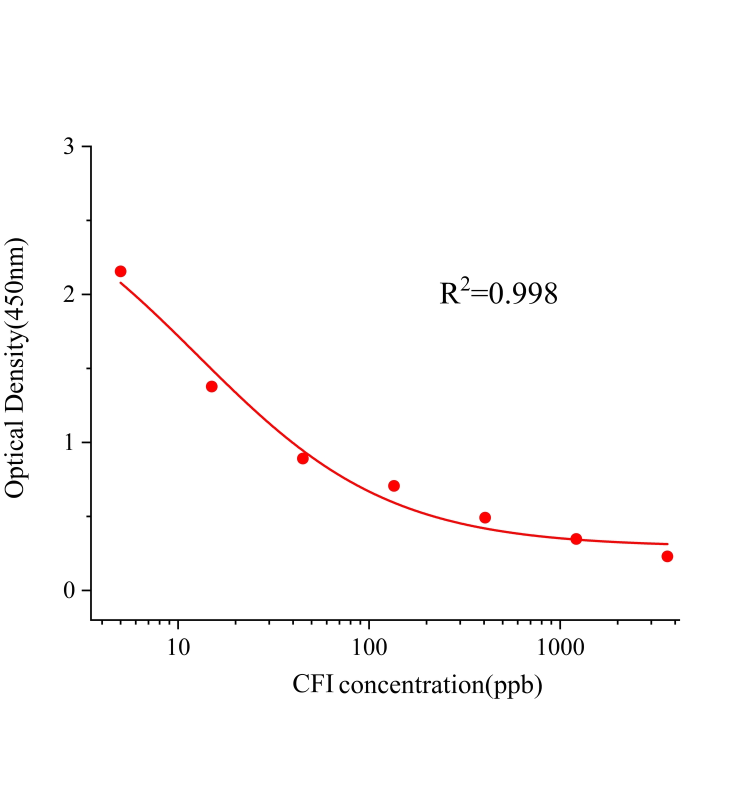 本试剂盒采用间接竞争ELISA方法,在酶标板微孔条上预包被偶联抗原,样本中CFI和微孔条上预包被的偶联抗原竞争CFI抗体,加入酶标二抗后,形成包被抗原-抗体-酶标二抗复合物。随后结合的酶催化TMB底物显色,样本吸光值与其含有的CFI成负相关。通过标准曲线可准确定量样品中CFI的含量。通过标准曲线计算所得值乘以样品处理的稀释倍数即为实际样品中CFI的含量。