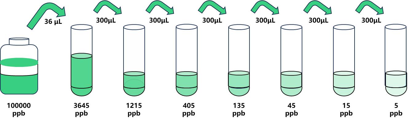标准品配制:试剂盒中取出标准品,准备7个试管,先将100ppm标准品(100µL)按需吸取一定量用1×稀释液稀释至3645 ppb(例:36µL的标准品母液+964µL的1×稀释液,制备得到1000μL的3645 ppb浓度标准品),随后在6个试管中分别加入600μL的1×稀释液,在这6个单独的试管中将3645 ppb标准品依次3倍倍比稀释至6个梯度,共配制7个浓度的标准品,依次为:3645 ppb、1215 ppb、405 ppb、135 ppb、45 ppb、15 ppb、5 ppb,从最高浓度标准品溶液中吸取300μL标准品到下一个试管中,轻轻吹打混匀,以此类推进行标准品的倍比稀释(如图所示),1×稀释液用作零浓度标准品(0ppb)。