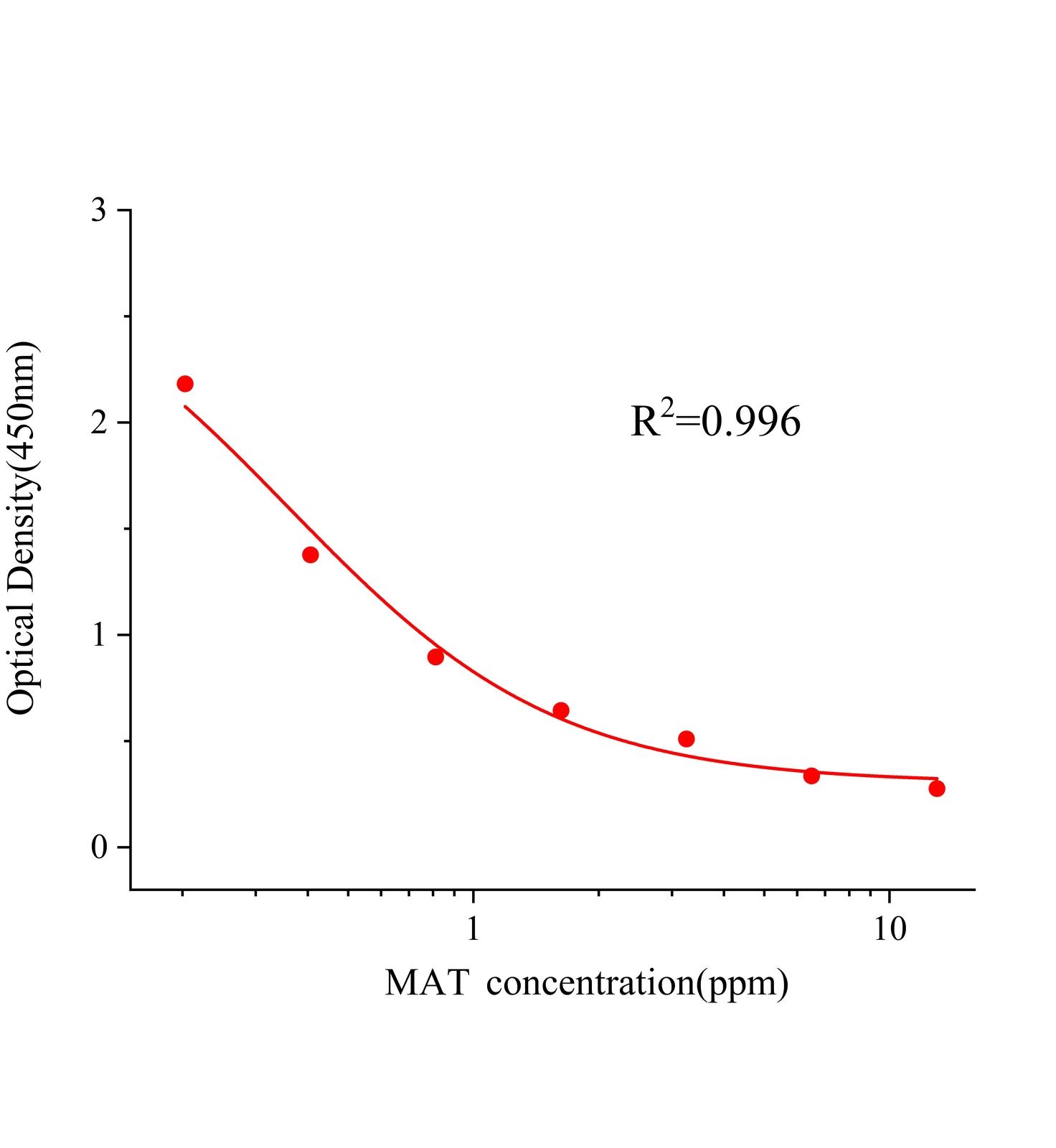 本试剂盒采用间接竞争ELISA方法,在酶标板微孔条上预包被偶联抗原,样本中MAT和微孔条上预包被的偶联抗原竞争MAT抗体,加入酶标二抗后,形成包被抗原-抗体-酶标二抗复合物。随后结合的酶催化TMB底物显色,样本吸光值与其含有的MAT成负相关。通过标准曲线可准确定量样品中MAT的含量。通过标准曲线计算所得值乘以样品处理的稀释倍数即为实际样品中MAT的含量。