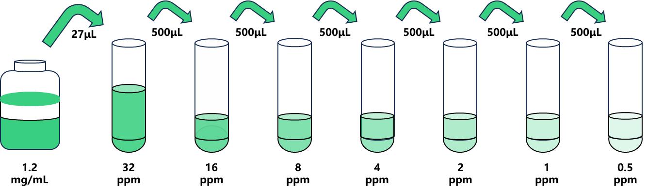 标准品配制:试剂盒中取出标准品,准备7个试管,先将1.2mg/mL标准品(200µL)按需吸取一定量用1×稀释液稀释至32 ppm(例:27µL的标准品母液+973µL的1×稀释液,制备得到1000μL的32 ppm浓度标准品),随后在6个试管中分别加入500μL的1×稀释液,在这6个单独的试管中将32 ppm标准品依次2倍倍比稀释至6个梯度,共配制7个浓度的标准品,依次为:32 ppm、16ppm、8ppm、4ppm、2ppm、1ppm、0.5ppm,从最高浓度标准品溶液中吸取500μL标准品到下一个试管中,轻轻吹打混匀,以此类推进行标准品的倍比稀释(如图所示),1×稀释液用作零浓度标准品(0ppm)。