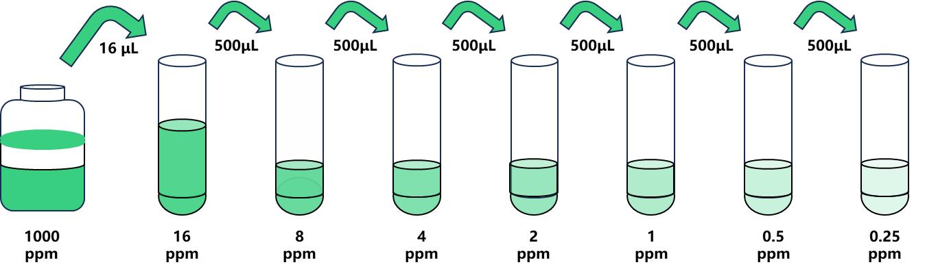 标准品配制:试剂盒中取出标准品,准备7个试管,先将1000ppm标准品(200µL)按需吸取一定量用1×稀释液稀释至16 ppm(例:16µL的标准品母液+984µL的1×稀释液,制备得到1000μL的16ppm浓度标准品),随后在6个试管中分别加入500μL的1×稀释液,在这6个单独的试管中将16ppm标准品依次2倍倍比稀释至6个梯度,共配制7个浓度的标准品,依次为:16ppm、8ppm、4ppm、2ppm、1ppm、0.5ppm、0.25ppm,从最高浓度标准品溶液中吸取500μL标准品到下一个试管中,轻轻吹打混匀,以此类推进行标准品的倍比稀释(如图所示),1×稀释液用作零浓度标准品(0ppm)。