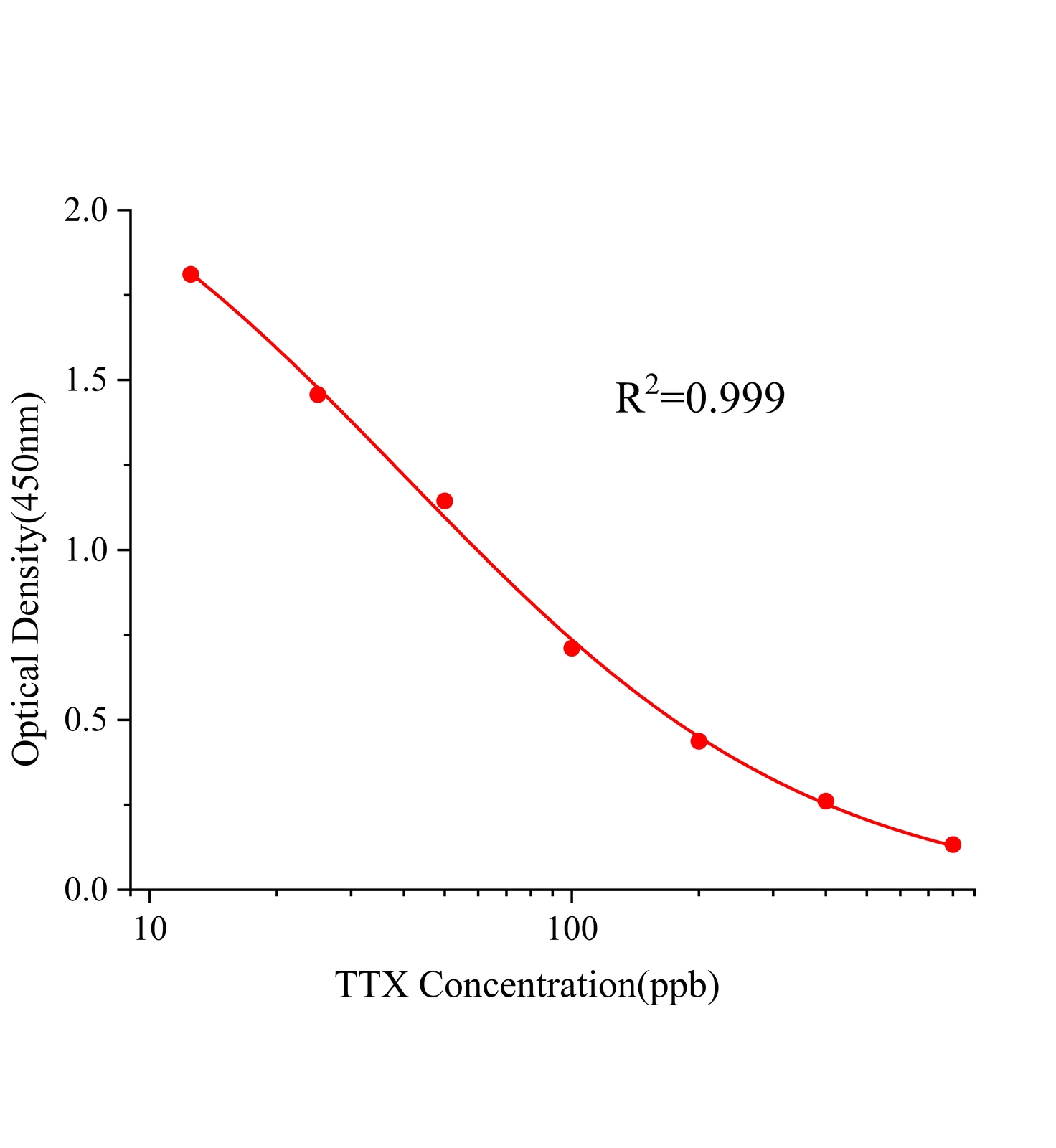 本试剂盒采用间接竞争ELISA方法,在酶标板微孔条上预包被偶联抗原,样本中河豚毒素和微孔条上预包被的偶联抗原竞争河豚毒素抗体,加入酶标二抗后,形成包被抗原-抗体-酶标二抗复合物。随后结合的酶催化TMB底物显色,样本吸光值与其含有的河豚毒素成负相关。通过标准曲线可准确定量样品中河豚毒素的含量。通过标准曲线计算所得值乘以样品处理的稀释倍数即为实际样品中河豚毒素的含量。
